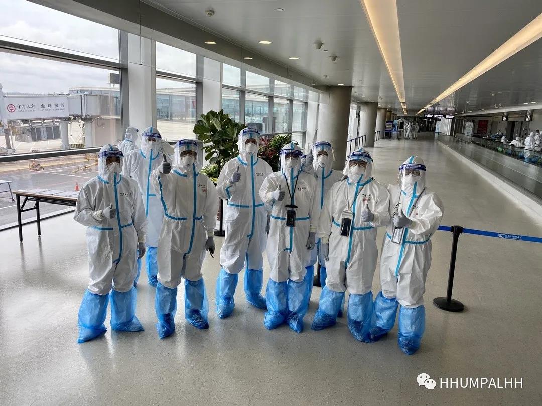 图为:张珺和同事用镜头记录下抗疫点滴 图为:张珺身着防护服等待航班降落