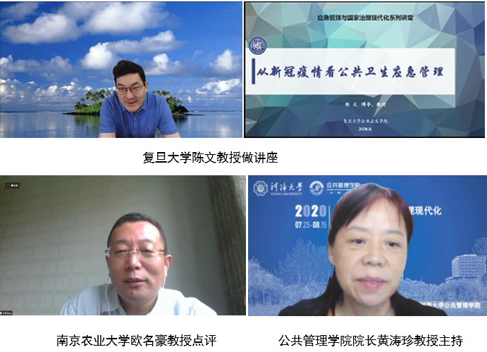 8月13日,“应急管理与国家治理现代化”云端系列名家讲堂第九讲如期举行。复旦大学医院管理研究所副所长、国务院学位委员会公共管理学科评议组成员、中国卫生经济学会医疗保险专业委员会副主任委员、中国医疗保险研究会常务理事、复旦大学公共卫生学院陈文教授以《从新型冠状肺炎疫情看公共卫生应急管理》为题,为河海师生带来了一场精彩的学术报告。南京农业大学欧名豪教授特邀点评。开云电竞网公共管理学院院长黄涛珍教授主持报告会。200余名师生认真聆听了报告。
