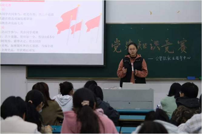 为庆祝中国共产党建党100周年,公共管理学院就业指导中心特此举办了党史知识竞赛活动。竞赛题目涉及四史、习近平总书记的七一讲话等相关内容,以此增进同学们对党史的了解。11月12日晚18:35分,公共管理学院团委就业指导中心“峥嵘百年史,党史照我心”党史知识竞赛在致高楼A105举行。在主持人介绍完比赛规则后,比赛正式开始。本次竞赛共分为三个环节:必答题部分,抢答题部分和挑战题部分。
