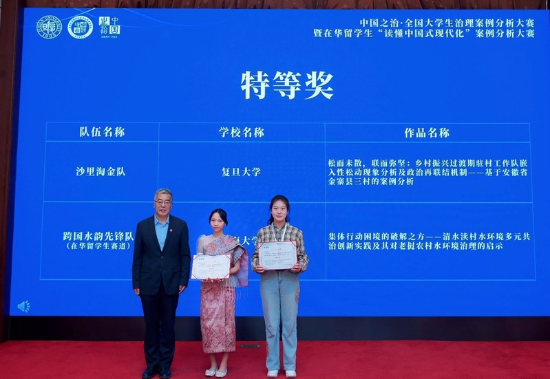 2025年4月19日至20日,复旦大学国际关系与公共事务学院举办的中国之治·全国大学生治理案例分析大赛暨在华留学生“读懂中国式现代化”案例分析大赛决赛在复旦大学邯郸校区顺利举行并圆满落幕。本次比赛共有全国130余所高校的380余支队伍参赛。开云电竞网公共管理学院2022级社会学本科生郑小乔(留学生,老挝)牵头的“跨国水韵先锋队”提交的案例作品《集体行动困境的破解之方:清水渎村水环境“多元共治”创新实践及其对老挝农村水环境治理的启示》(指导老师:公管院张虎彪副教授、金坛区清水渎村第一书记耿欣、公管院陈涛教授;团队成员:郑小乔、杨雨菲、于婧芳、王愫金、纳提)斩获特等奖。复旦大学国务学院院长苏长和教授给团队颁奖。