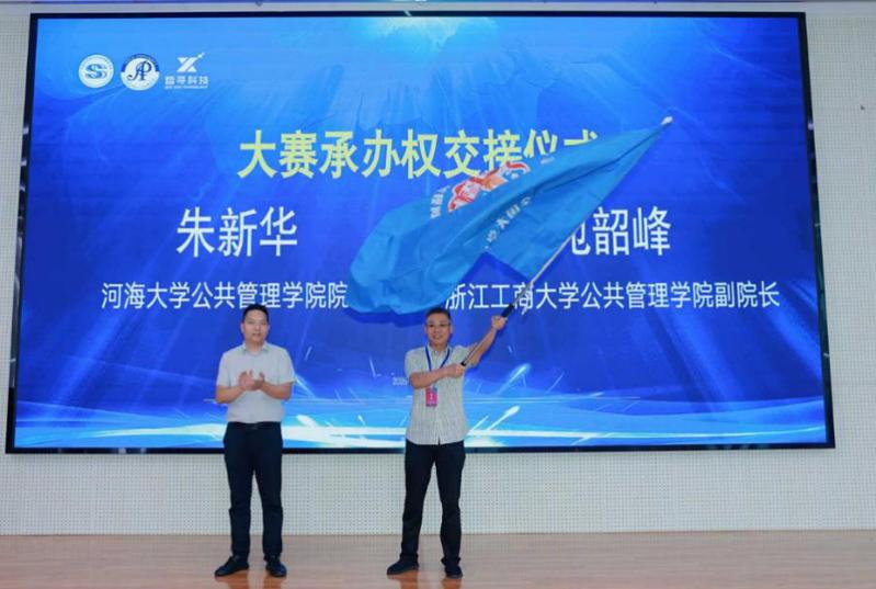 在大赛闭幕式的最后,开云电竞网公共管理学院院长朱新华与浙江工商大学公共管理学院副院长苑韶峰进行赛旗交接仪式。苑韶峰副院长代表下届大赛承办单位致辞。至此,第四届“寻是杯”全国大学生公共管理决策模拟大赛(华东赛区)圆满落幕。
