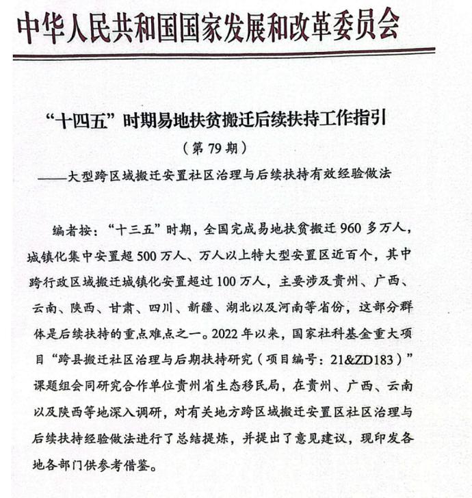 近日,国家发展和改革委员会地区振兴司印发《“十四五”时期易地扶贫搬迁后续扶持工作指引(第79期)——大型跨区域搬迁安置社区治理与后续扶持有效经验做法》(以下简称《工作指引》),向全国有关省(自治区、直辖市)发展改革委推广我校陈绍军教授课题组在贵州、广西、云南、陕西等地调研总结提炼的大型跨区域搬迁安置社区治理与后续扶持有效经验做法及意见建议。并抄报中央财办(中央农办)秘书局、国务院研究室农村司,抄送教育部、财政部、人社部、农业农村部、商务部、卫健委、人民银行等相关司局,以及国家开发银行、中国农业发展银行乡村振兴部,国家发展改革委内相关司局。