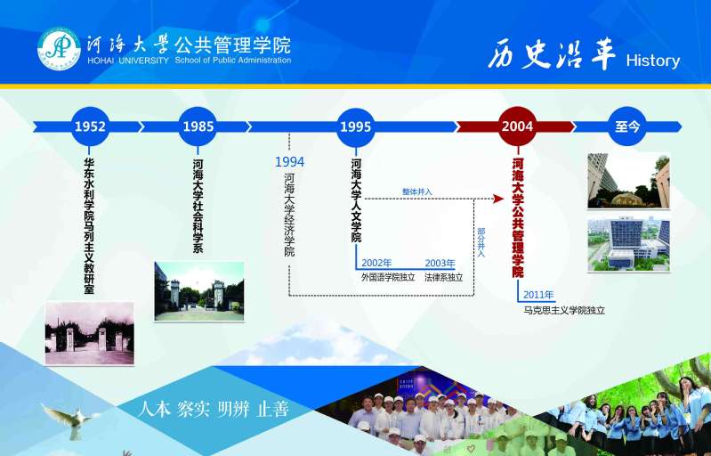 公共管理学院的前身可追溯到1952年成立的华东水利学院马列主义教研室。1985年,成立了社会科学系。1992年根据经济和社会发展的形势和需要,成立了水利部移民研究中心。1995年,以社会科学系和外语系为基础,成立人文学院。2002年,外语系从人文学院中分出,单独成立外国语学院。2004年,人文学院(法律系行政独立)与移民研究中心整合为公共管理学院。2011年,哲学系和政治学系从公共管理学院分出,单独成立马克思主义学院。