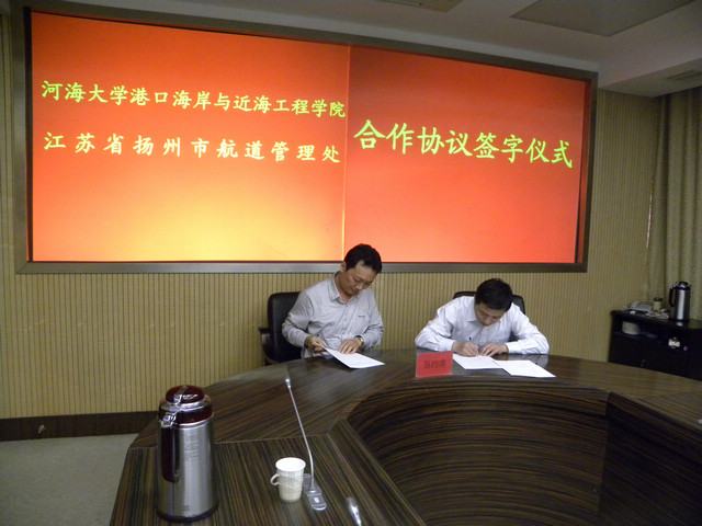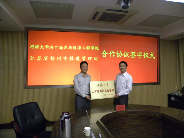 参加签字仪式的有扬州市航道管理处夏正东处长、赵贵书书记、张恒焰副处长、张立副处长等。会议由夏正东处长主持,夏正东处长、朱宏亮书记就双方前期的合作及以后的全面合作关系分别做了重要讲话。随后由夏正东处长、朱宏亮书记代表双方签订合作协议书并揭牌。