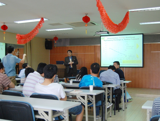 6月5日,杰克逊州立大学土木与环境工程系主任Farshad Amini教授应邀来到开云电竞网,在严恺馆702就海堤溢流溃堤、海堤坡面防护等方面的研究为港航院师生做了一场学术报告。本次报告主要介绍了三种海堤背水坡的保护系统(碾压混凝土 Roller Compaction Concrete、铰接式护坡砖 Articulated Concrete Blocks、高性能加筋草皮 High Performance Turf Reinforcement Mat)溢流和波浪溢流的大型物理试验的研究成果。该试验是在美国俄勒冈州立大学的波浪研究实验室内进行的原物尺寸的水槽实验,消除了前人使用小尺度海堤引起的尺度效应。通过试验,对每一种海堤保护系统上发生溢流和波浪溢流时的详细水力学数据(包括流量、流速、水深、波浪特征等)给出了预测方法,对海堤保护系统表面的侵蚀特征做出了总结;并对三种海堤保护系统的水力学表现进行比较,给出了三种海堤保护系统的保护作用的评估。