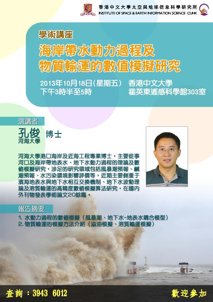 2013年10月18日,我院孔俊副教授应香港中文大学太空与地球信息科学研究所邀请,在香港中文大学开展学术讲座《海岸带水动力过程及物质输运的数值模拟研究》。孔俊副教授长期从事河口及海岸带地表水、地下水动力过程的理论及数值模拟研究,涉足的研究领域包括风暴潮预报、咸潮预报、水污染环境影响评价等,近年来侧重于滨海地表水与地下水相互交换机制、地下水波动理论及水体中污染物输运的高精度数值算法研究,在国内外刊物发表学术论文20余篇。本次讲座,孔俊副教授对其近年来提出的高精度物质输运模拟算法“A High-resolution method for the depth-integrated solute transport equation based on an unstructured mesh”和地表水—地下水整体模型“A new model for coupling surface and subsurface water flows: With an application to a lagoon” 进行了宣讲,并与中大科研人员就下阶段的合作进行了深入交流。