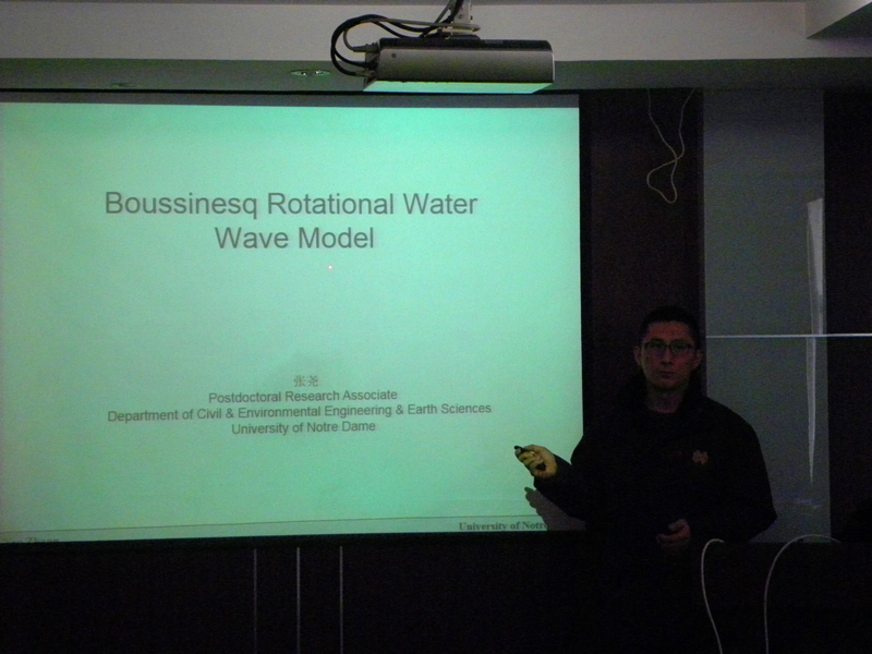 2014年12月12日上午,美国圣母大学土木与环境工程及地球科学系张尧博士来我院访问交流。张尧博士为我院师生作了题为“Boussinesq-Green-Naghdi rotational water wave model: theory and applications”的学术报告,详细阐述了其开发的Boussinesq-Green-Naghdi有旋水动力模型,并介绍了该模型在菲律宾沿海与美国新泽西州海岸灾害研究中的实际工程应用。报告后针对新模型与传统Boussinesq模型的改进程度及其在模拟水波有旋运动上的优势等问题,张尧博士与我院师生进行了热烈的讨论。