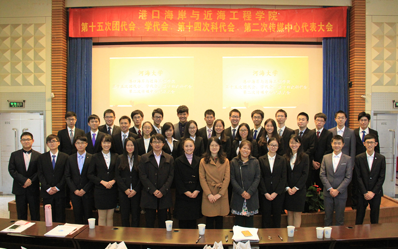 2015年11月14日上午,港口海岸与近海工程学院第十五次团代会、学代会,第十四次科代会,第二次传媒中心代表大会在江宁会议中心二楼报告厅如期举行。校团委杨天副书记,港航院党委胡忠华书记、姜海霞副书记,校学生会副主席宁珏同学,校学生科协主席陈程同学,校传媒中心新媒体部部长徐少卿同学,土木院团委吴昊书记,外语院团委王璐书记,港航院团委副书记、13级本科生辅导员王玲老师,14级本科生辅导员季超老师,15级本科生辅导员安杰晶老师,12级本科生辅导员助管张清扬出席本次会议。