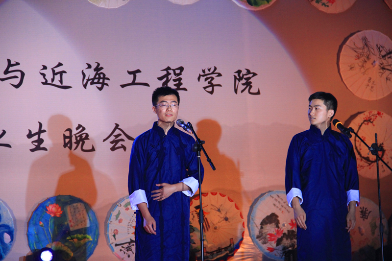 晚会会场整体风格为传统水墨风,以廉洁主题手绘花伞、诚信主题手绘面扇装饰,主题墙以传统文化中“四君子“为背景,蕴含着学院对毕业生的希冀和祝愿。整场晚会由学院2016届毕业生自编、自导、自演,现场气氛温馨融洽、高潮迭起。晚会在研究生一段活力四射的啦啦操《青春派对》中拉开帷幕,合唱《南山南(河海版)》、话剧《五十年后》、相声《我的大学生活》、诗朗诵《如果在河海拥有爱情》等等形式多样、内容丰富的节目,无不表达了毕业生对大学生活的留念之情和对母校的深深祝福。晚会期间,郑金海院长亲自为毕业生献上祝福,邵宇阳、张弛、周晶晶三位班主任参与表演,为同学们的大学生活画上圆满的句号。