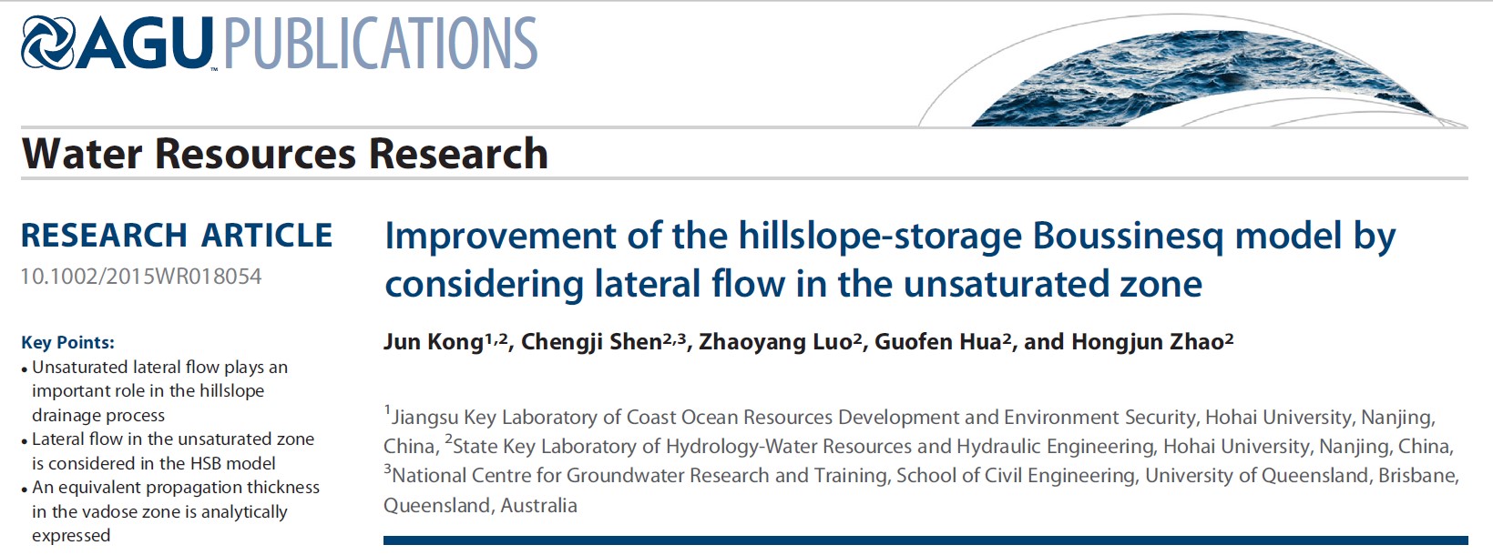 近期,我院孔俊教授在国际水文学顶级刊物《Water Resources Research》发表论文“Improvement of the Hillslope-Storage Boussinesq model by considering lateral flow in unsaturated zone”。