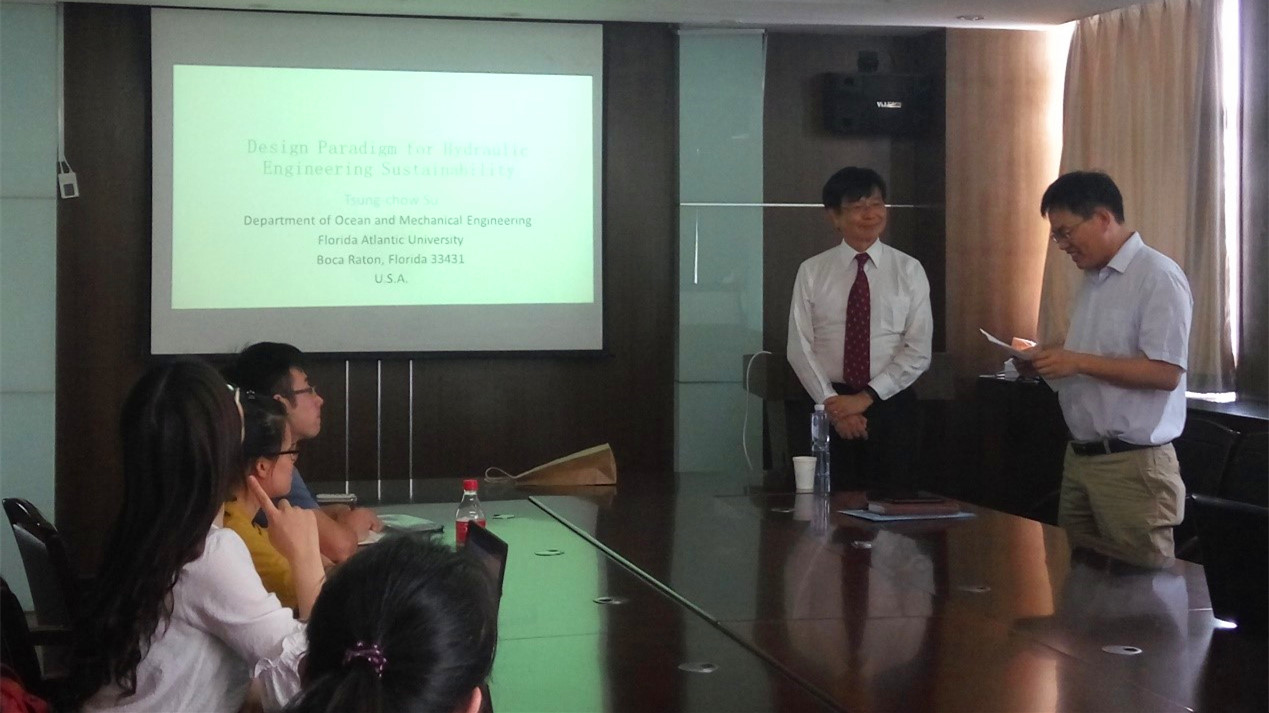 上午,苏教授和谢副教授在黄挺老师带领下先后参观了水文水资源与水利工程科学国家重点实验室和我院港口航道工程与海岸海洋科学实验中心。下午,苏教授在严恺馆会议室做了题为“Design Paradigm for Hydraulic Engineering Sustainability”的学术报告,针对流固耦合、泥沙输运以及工程冲刷防护等问题,介绍了水利工程结构的永续性设计及优化研究。苏教授从中国古代哲学的视角出发,揭示了众多问题复杂表象后的核心实质和解决方案,传递了“大道至简”的科研理念,为参会人员开展科研工作带来了新颖的思路,引发了热烈地交流与探讨。会议由副院长张继生教授主持,来自港航院和水文院的20多位师生参加。