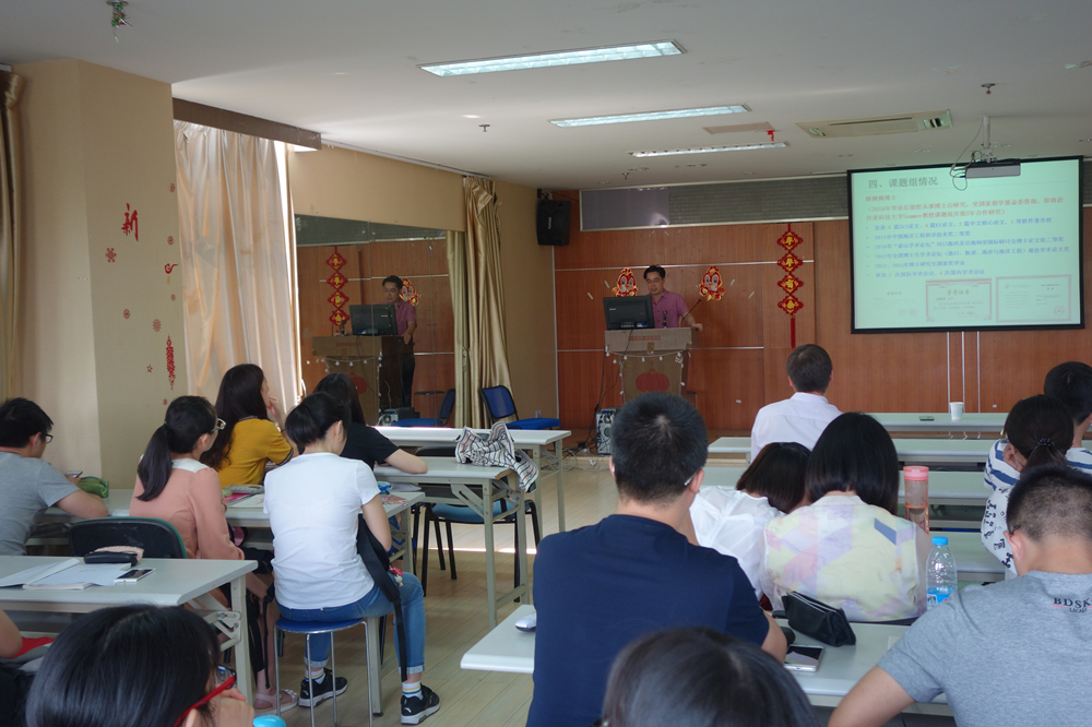 下午两点整,首先由徐福敏教授带来了她的科研经历。徐老师从事于波浪、风暴潮的数学模型研究,她丰富的海外科研工作经历令同学们赞佩不已。在与同学们交流中,徐老师耐心讲解了她对硕士生的培养训练,包括了编程能力、阅读文献进行知识储备的能力、独立科研的能力等。接下来上台的是张弛副教授,他是“土生土长”的河海人,其科研方向是海岸泥沙运动与沙滩整治,他还介绍了在他的课题组中实行的周会制度、文化体育活动。张老师与研究生们聚餐时其乐融融的场景让在座同学们羡慕不已,消除了同学们与老师之间的隔阂。第三位导师是薛米安副教授,他深入浅出的介绍了液体晃荡现象,并与实际工程紧密结合,详细剖析了工程中的液体晃荡问题,例如船舶中的液体晃荡、地震中的液体晃荡等,将同学们从未接触的知识现象解释得浅显易懂。最后一位导师是侯利军副研究员,目前在做高性能材料及混凝土修复与加固方面的研究。侯老师谈及了一些对硕士研究生的要求,他认为对硕士研究生而言最重要的是要肯做事;其次要善于思考实验背后的现象。活动最后,张副院长总结陈词,宣讲会圆满落幕。