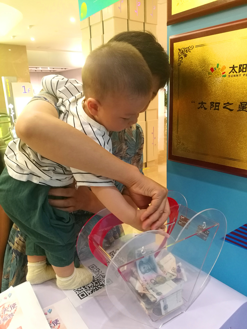 队员们在那里做志愿的几天,深深地感受到中心在资金这方面的迫切需求,于是,联合21世纪太阳城购物中心共同举办了一次义卖、募捐活动。7月14日下午1点活动在太阳城一楼B区爱心公益角正式开始,虽然有一些人质疑活动的真实性,队员们也被无数句“对不起”“不好意思,我赶时间”打击过,但是还是有很多人鼓励支持队员们的活动。正如一个父亲对自己的孩子所说的那样,“他们需要我们的帮助,我们每个人都奉献一点,世界才会更美好”。至活动结束,队员们义卖募捐共得善款1426.8元,虽然数额不多,但是这是人们爱心的凝聚,捧着沉甸甸的爱心箱,队员们脸上都露出满足的笑容。