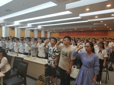 2018级辅导员顾钰恒老师带领全体新生庄严宣誓,力争做一名合格的港航人。
