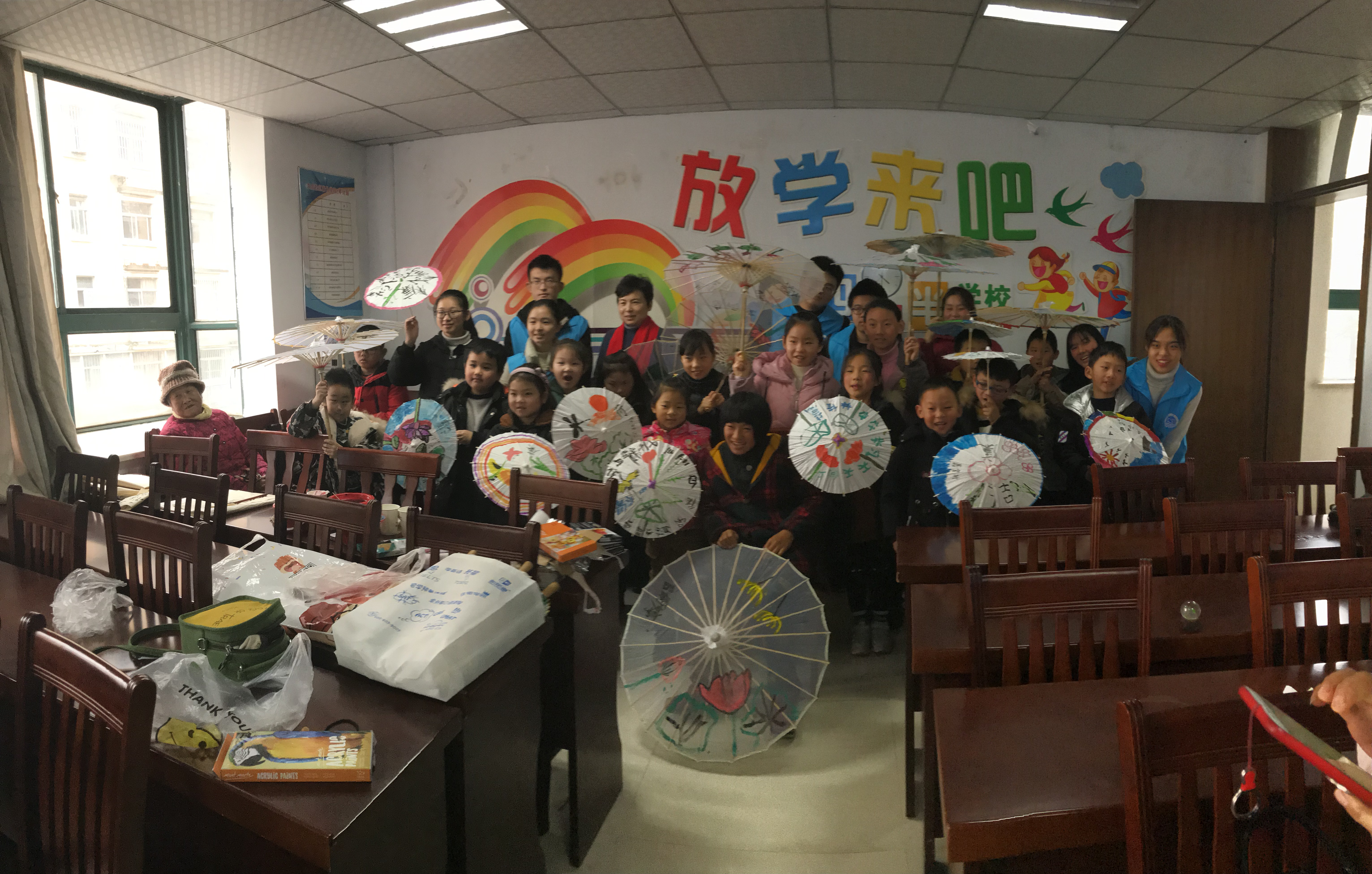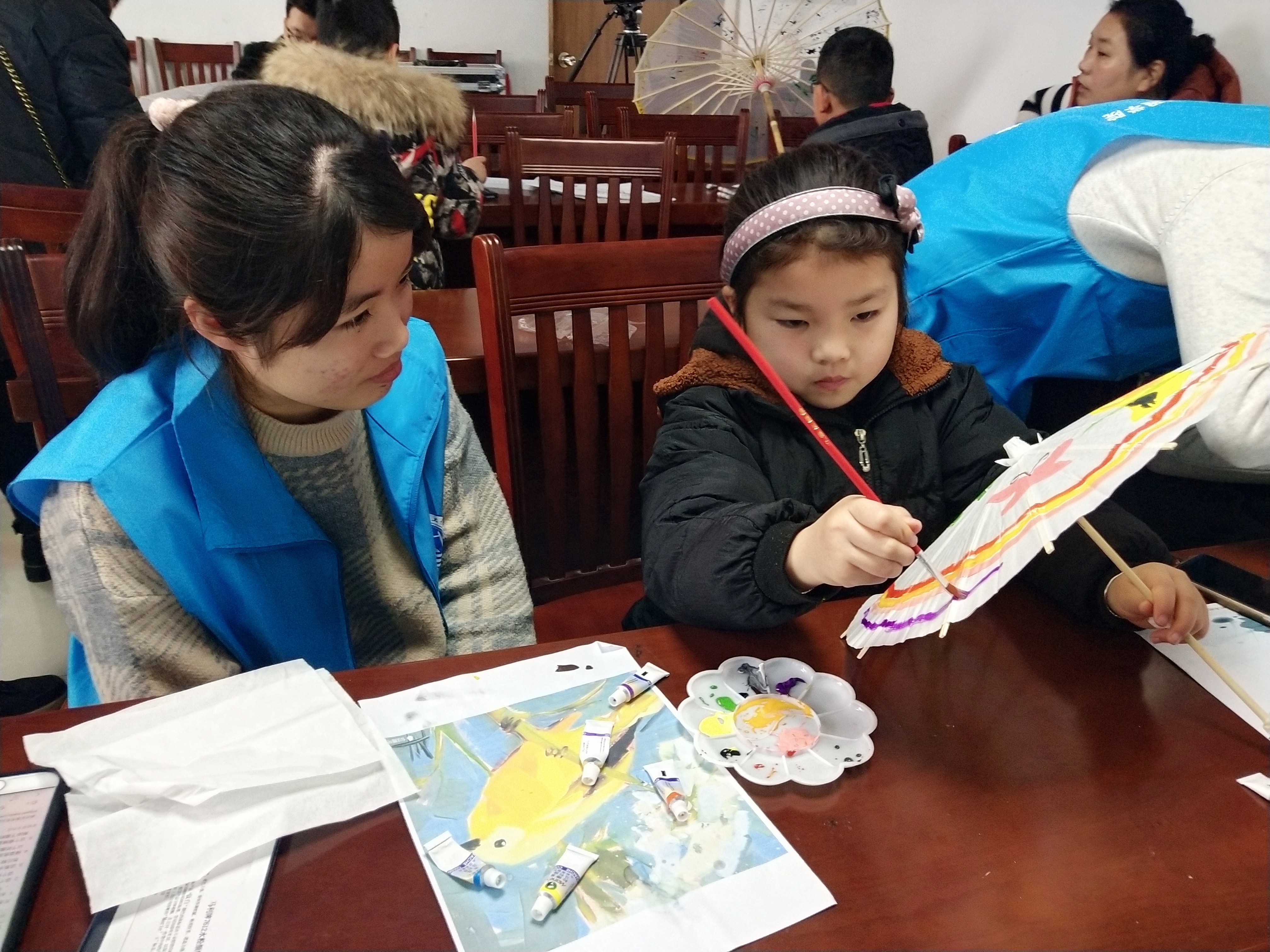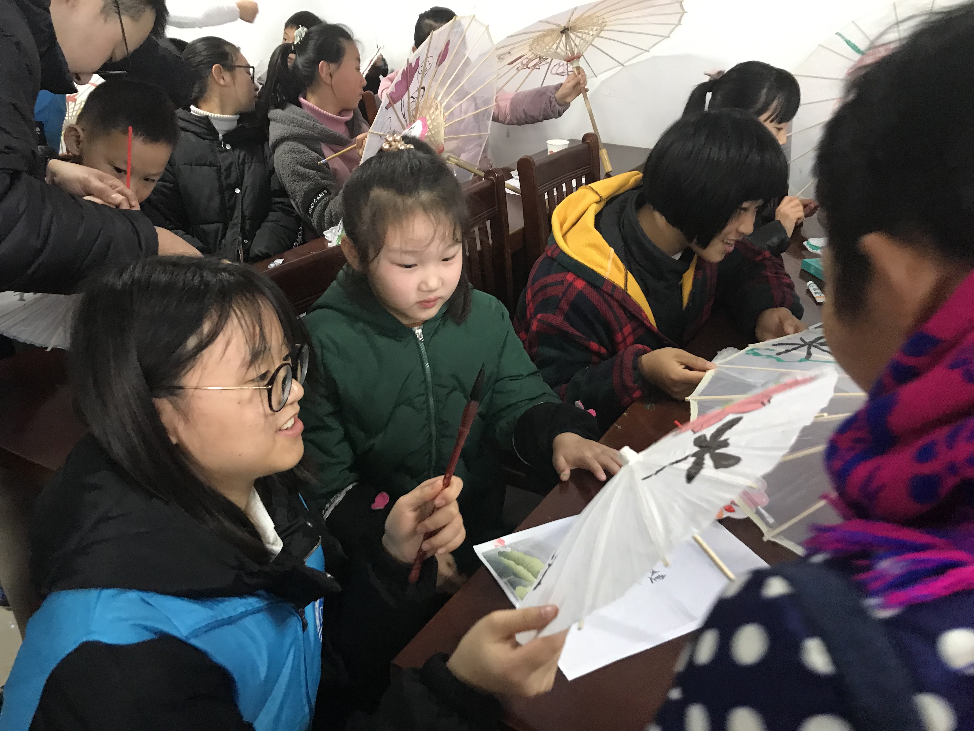 志愿者们精心地为孩子们准备了空白油纸伞、颜料、画笔、调色盘等绘画工具,为了使孩子们发挥他们创意无穷的小脑袋,青协志愿者进行现场书法展示和创作来激发创作灵感。随后志愿者发放材料供孩子和家长们创作。