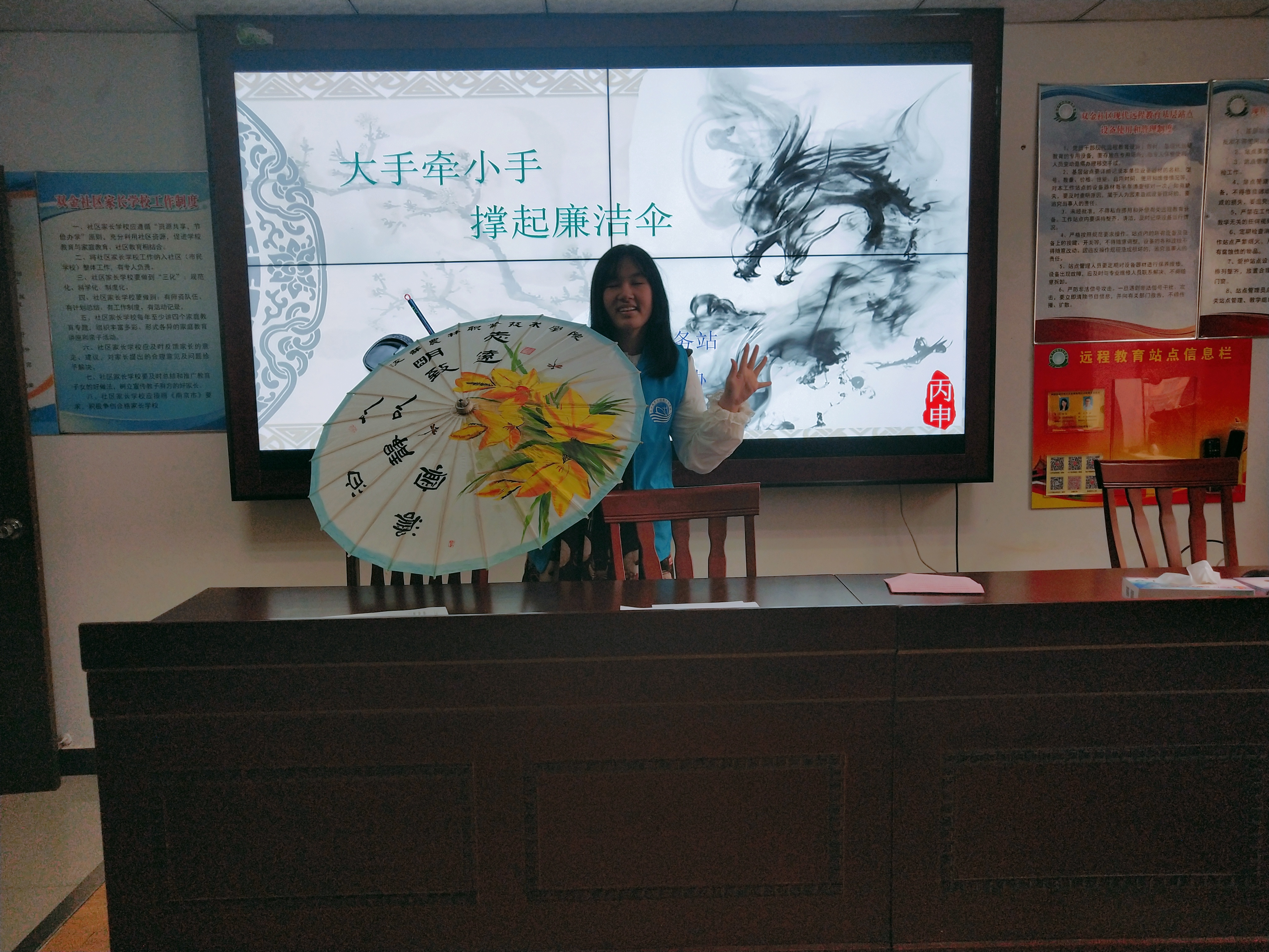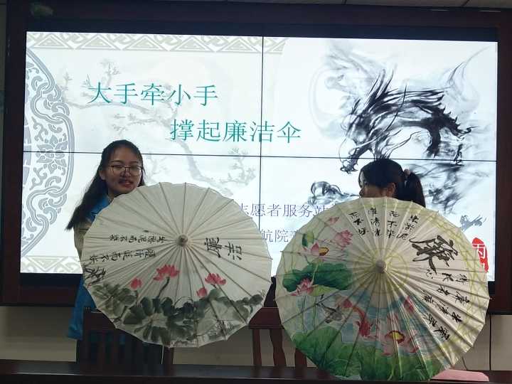 活动开场,港航学院青协志愿者先向孩子和家长介绍油纸伞悠久的历史和文化特色以及廉洁伞的由来和寓意,为了生动 形象的让孩子们理解廉洁伞的含义、创作理念、上色技巧以及画面布局,六位青协志愿者依次展示获奖的优秀廉洁伞作品,《清气·幽香》描绘了“四君子”中的翠竹与兰花,竹的寓意是清雅澹泊、谦谦君子,兰的寓意是深谷幽香、世上贤达;竹与兰所象征的高尚的情操与洁身自好的品格与清正廉洁之风相呼应。《荷塘仙语 清廉本色》作品描绘了莲花盛开的夏日荷塘,仙鹤傲立其中,似与莲花轻声耳语。希望能够效仿鹤与莲的高洁品格,堂堂正正做人,清清白白做事,清正廉明,无愧于心。