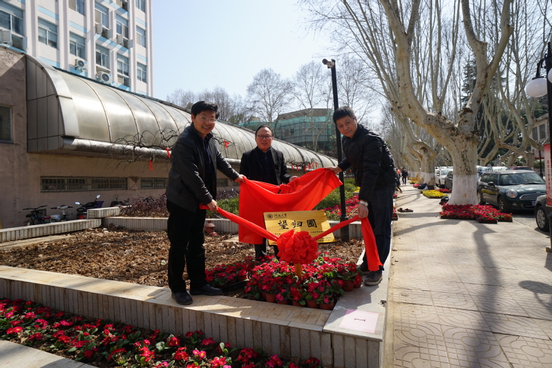 在“开工第一铲”仪式中,郭祥林处长、康红强书记、胡忠华书记、吴青山副处长、姜海霞副书记与学生代表在严恺馆台阶旁,齐力种下了一棵海棠树,为植树活动开启了良好的开端。随后,各组师生在专业技术人员的带领下正式开始了杜鹃花苗圃的种植。后勤处和学院的各位领导老师也纷纷“撸起袖子”,负责了1号花圃的栽种工作,为同学们树立了良好的榜样。在紧张有序的栽种后,由各组学生代表将写有2019届全体本科毕业生未来三年小目标的“梦想合伙人”红丝带系于园圃的树枝上,以见证同学们的成长。活动最后,康红强书记、郭祥林处长、胡忠华书记为“望归圃”举行了揭牌仪式,象征着活动圆满结束。