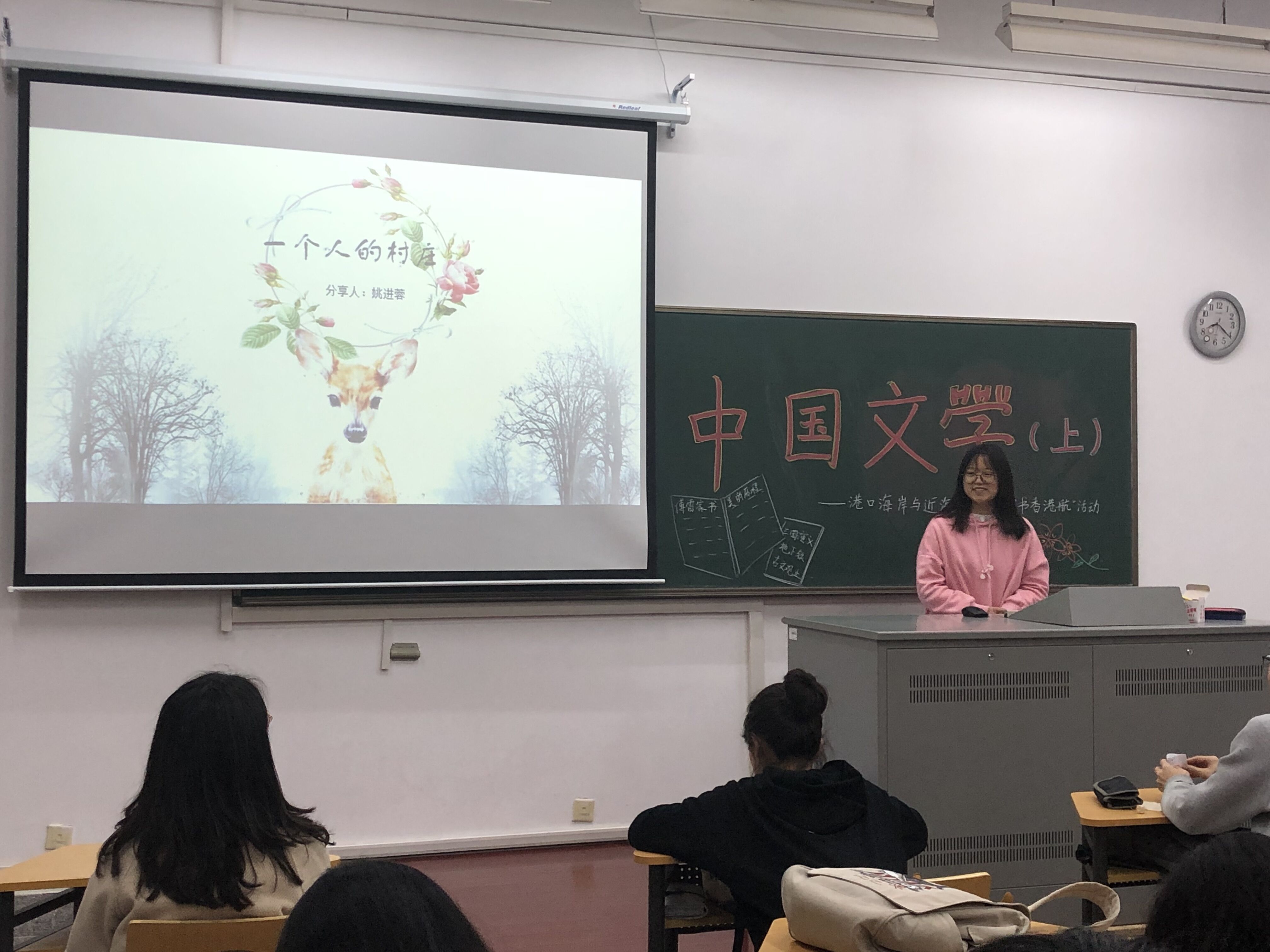 第一场主题为中国文学,来自港航院2018级的20余位同学齐聚一堂,对中华文化追本溯源,碰撞出思维的火花。读书交流分享会在18:30准时开始。第一位上场的苏雅莹同学用清新简约的插画书《地下铁》,讲述了一个看不见世界的少女用童真的小心灵去聆听这个世界,在她的世界里,一切都是美好,温暖,幸运的,即便处于逆境之中,也能看到幸福的光芒。紧接着上场的徐双余同学讲述了李泽厚眼中的美,娓娓道来《美的历程》。张高远同学则选择了颇具古典韵味的《古文观止》,向到场的同学展现古文之美。在《文化苦旅》中,陈钰同学选择了感悟余秋雨先生虔诚的、膜拜的和陶醉的 审美心境,感悟人生真谛和对文化灵魂的探索。于昕彤同学则选择用与自生经历相结合的方式讲述《撒哈拉的故事》,最后上场的姚进蓉同学带来了散文集《一个人的村庄》,诉说对土地的热爱。整场活动在安静、享受的氛围中结束。