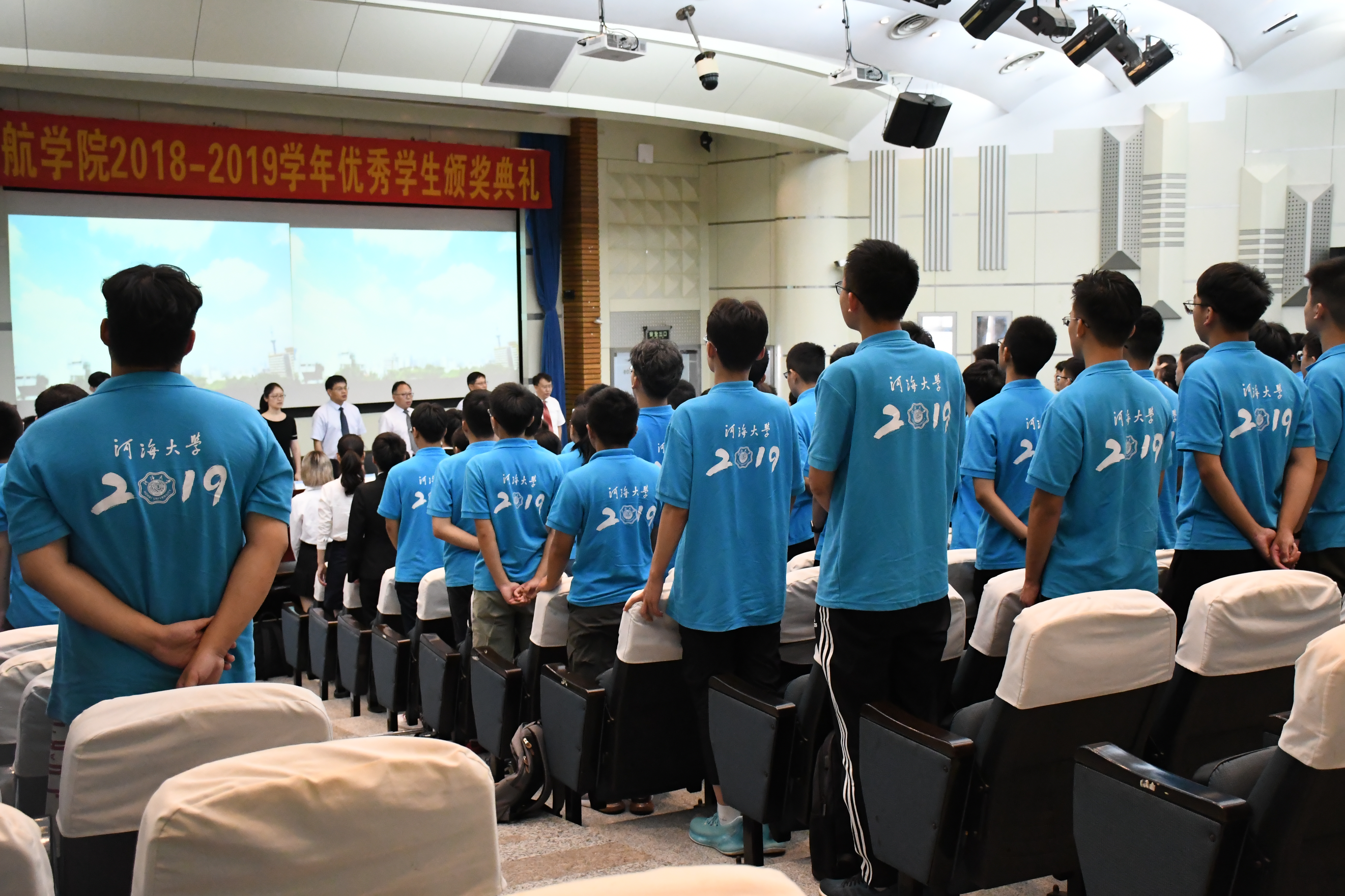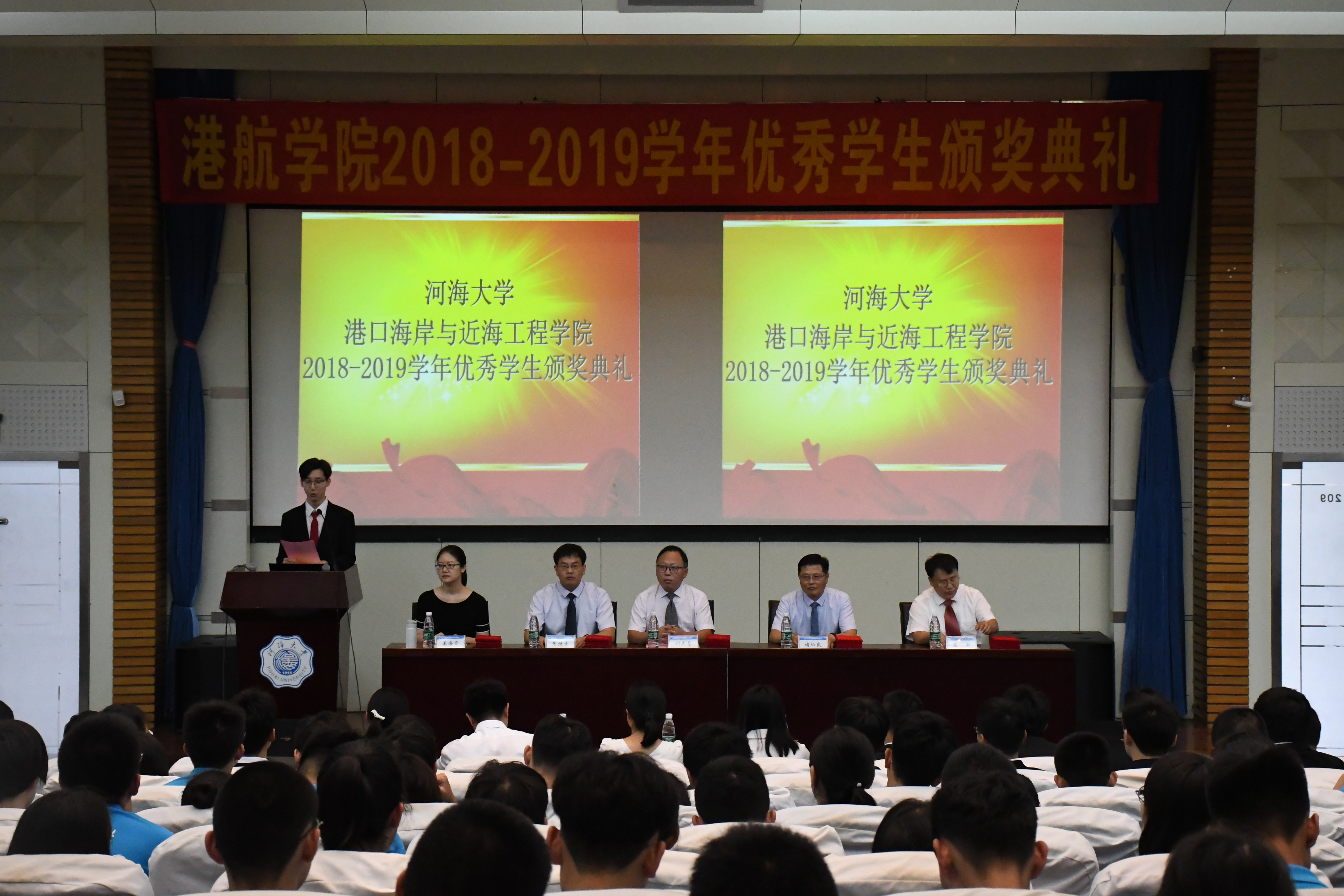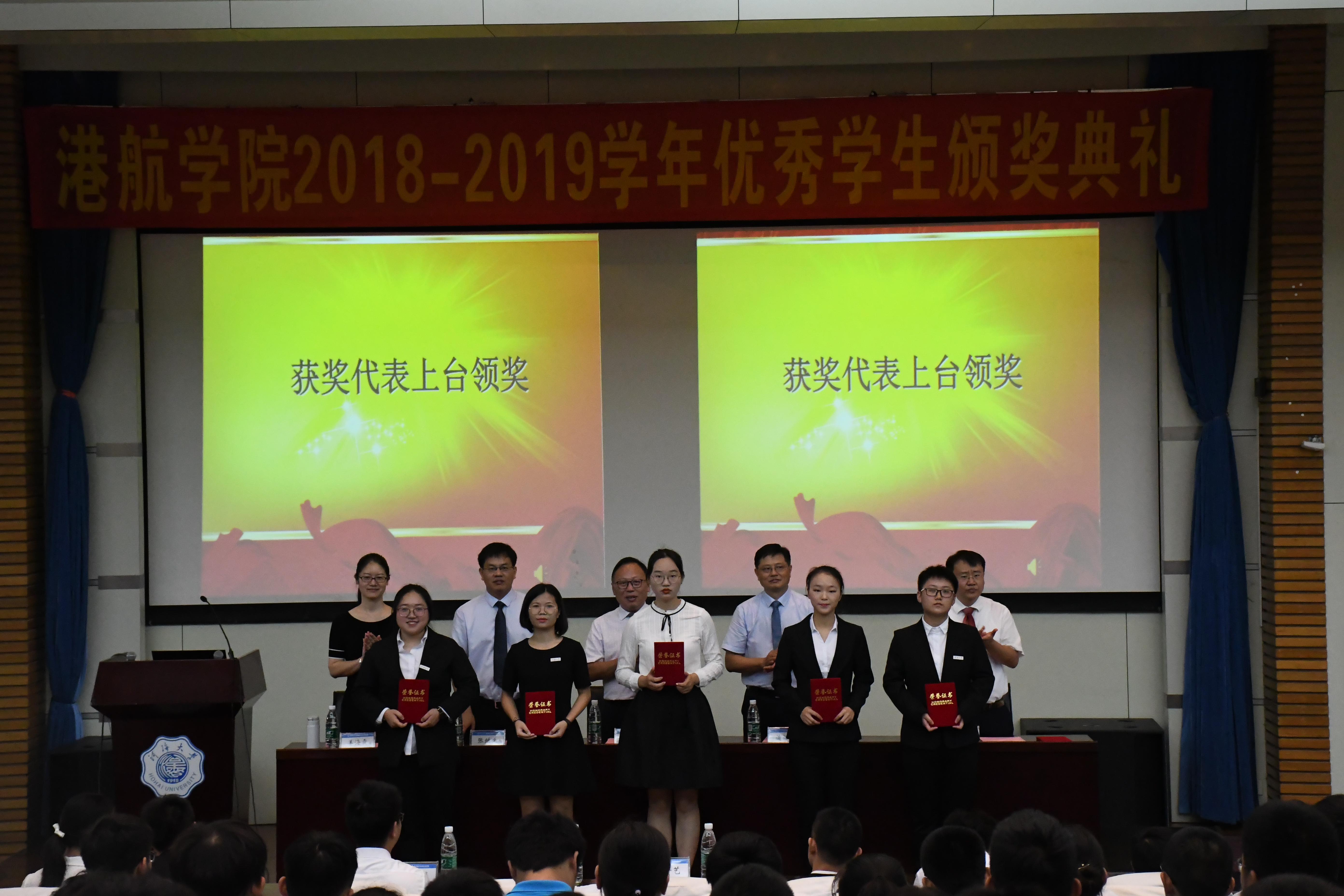 伴随着庄严的国歌声,颁奖典礼正式开始。张蔚副院长宣读了2018—2019学年优秀学生名单,其中包括各类奖学金获得者、省级以上竞赛获奖者及各类荣誉称号获得者。优秀学生代表依次上台领奖,红灿灿的获奖证书背后折射出他们辛勤的努力,为全体新生树立了榜样。