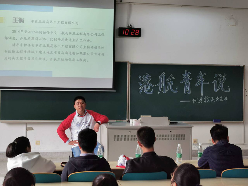 王衡分享了他对于工程一线的心得,如在施工现场要把握学习时间,锻炼自身交流能力,并有目的有规划地进行相关专业规范的了解。他强调,不管身处何地,最重要的是港航人的传承感,我们要做一名有责任担当、有追求的港航人。