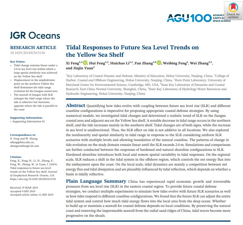 近日,隶属海岸灾害及防护教育部重点实验室(开云电竞网),(Key Laboratory of Coastal Disaster and Defence (Hohai University), Ministry of Education)的冯曦老师携研究生冯辉、李慧超等在国际学术TOP期刊《Journal of Geophysical Research: Oceans》上发表高质量研究论文“Tidal responses to future sea level trends on the Yellow Sea shelf”。该论文阐明了复杂海岸带环境下,海平面上升与潮能演化之间的动态规律,首次界定了在中国特有的开放式海岸条件下,近岸潮能演变规律由线性形态到非线性形态的零界位置。同时,指出了在刚性和柔性护岸不同条件下,黄海大陆架近岸潮能应对海平面上升的自适性。该论文反映了平行岸线的前进潮波与垂直岸线的类驻波潮波与不同护岸之间的组合关系;从运动机制与动力机制两方面分别揭示了柔性护岸与刚性护岸工程对近未来(100年间)潮能发展的状态。该成果不仅具有重要的理论意义,而且对目前我国的生态护岸工程也有广泛的现实借鉴作用。