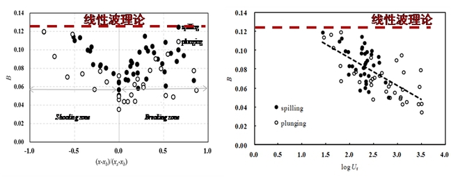 图1.1.5 第三类超谐波布拉格共振透射系数随入射波波数变化(左)与透射波沿程演化(右) 揭示了沙坝地形上强非线性波浪的波形系数(1/20~1/8)和波峰面坡度(0.1~0.8)显著偏离理论值且与厄塞尔数呈线性和指数型关系,诠释了波浪变形产生的波生流时均压强梯度是引起底部边界层余流“层内向岸、层外离岸”和“浅化区向岸、破波区离岸”形态转化的成因。