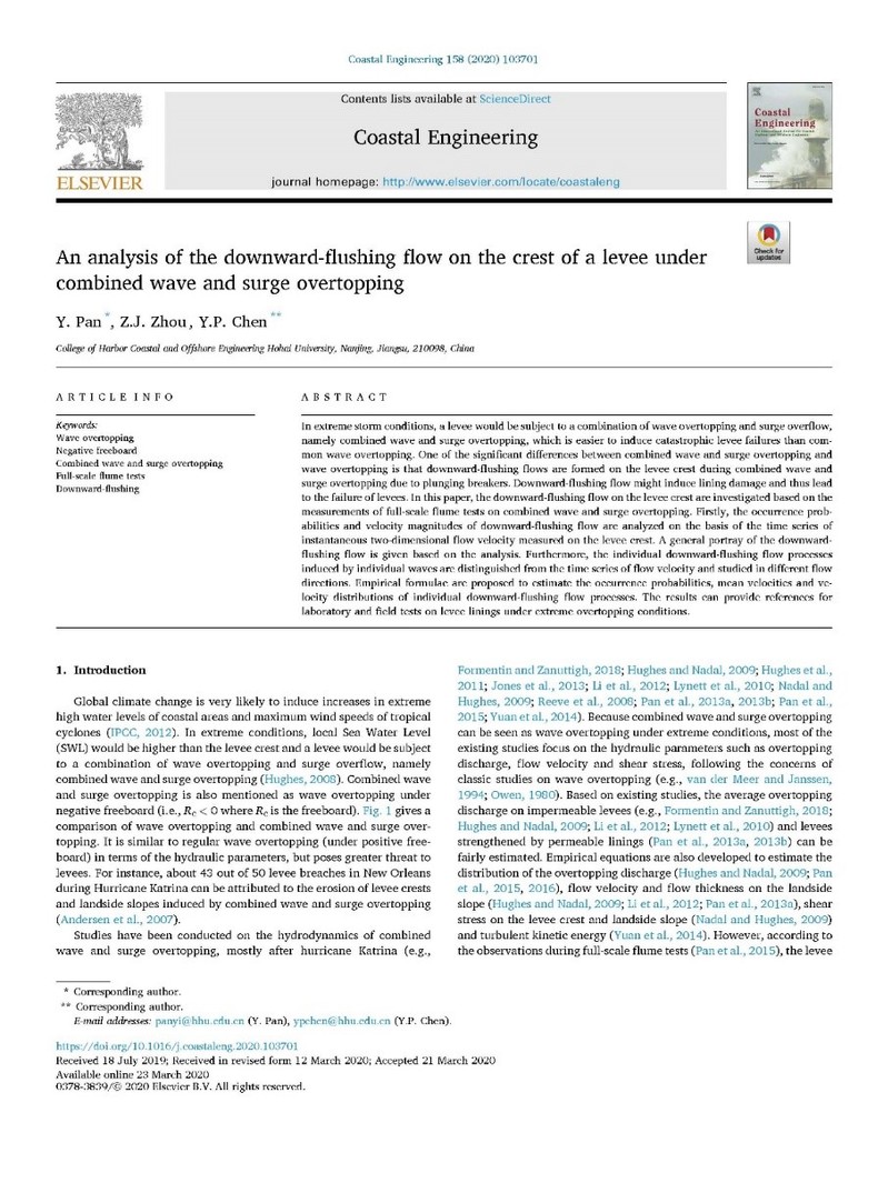 近日,我院教师潘毅、陈永平和博士生周子骏在中信所一区,海岸工程类排名第一的行业Top期刊《Coastal Engineering》上发表高质量学术论文:“An analysis of the downward-flushing flow on the crest of a levee under combined wave and surge overtopping”。