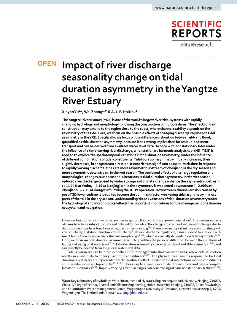 近日,我院三年级硕士研究郁夏琰和指导教师张蔚教授(通讯作者),与Journal of Geophysical Research(JGR)-Earth Surface主编Hoitink教授合作,在Nature旗下期刊《Scientific Reports》发表高水平论文 “Impact of river discharge seasonality change on tidal duration asymmetry in the Yangtze River Estuary”。研究课题得到了国家重点研发计划项目“长江口水沙变化与重大工程安全(2017YFC0405400)”的资助。