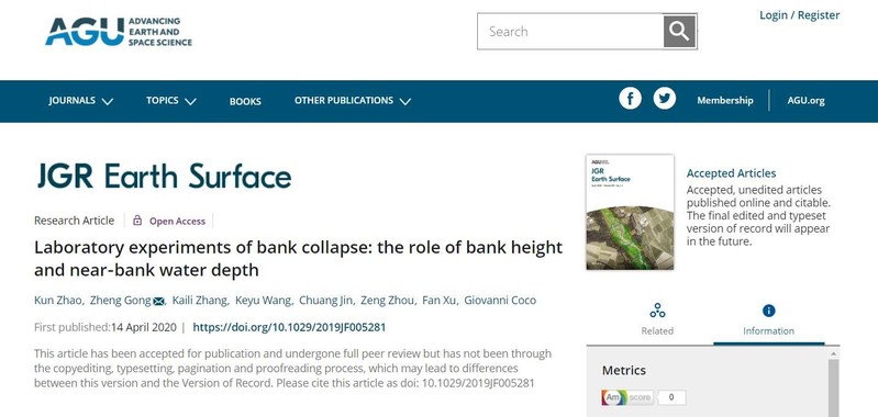 近日,我院潮滩动力地貌研究团队博士生赵堃在地貌学权威期刊《Journal of Geophysical Research: Earth Surface》(一区Top, 2019年影响因子4.25)上发表了题为Laboratory experiments of bank collapse: the role of bank height and near-bank water depth的学术论文,是继该团队在知名刊物《Geomorphology》和《Water Resource Research》发表岸壁坍塌相关研究后的又一突破。论文第一作者为我院赵堃博士生,合作作者包括龚政教授、张凯丽博士生,王客予硕士生,周曾教授,以及新西兰奥克兰大学靳闯博士,Giovanni Coco副教授和华东师范大学徐凡博士。