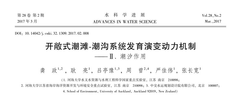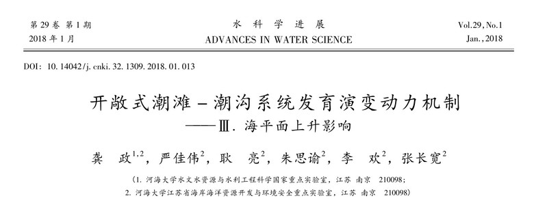 近日,我院龚政教授为第一作者于2018年发表在《水科学进展》期刊的论文“开敞式潮滩-潮沟系统发育演变动力机制——ⅲ.海平面上升影响”获评该刊的优秀论文。2018—2019年《水科学进展》共刊登论文186篇,根据论文引证指标及学术影响,经编委会推荐,共评选出20篇优秀论文(我校共2篇入选)。本优秀论文的合作作者包括李欢副教授、张长宽教授以及龚政教授指导的3名硕士生。