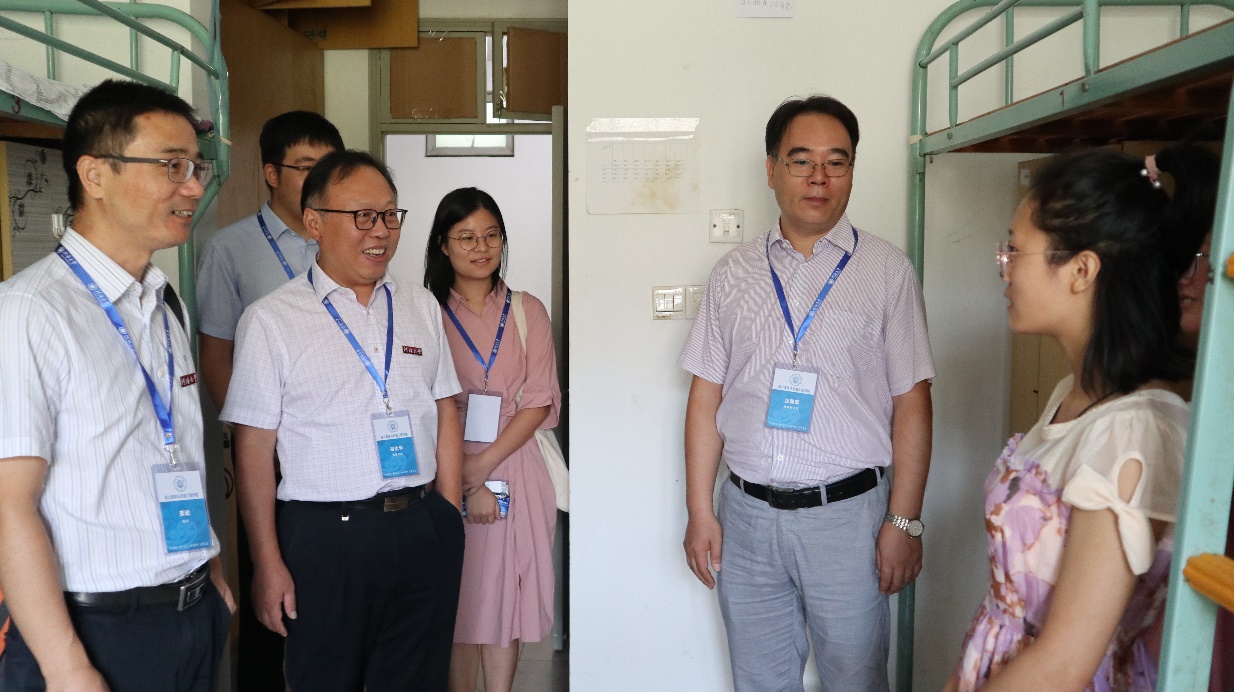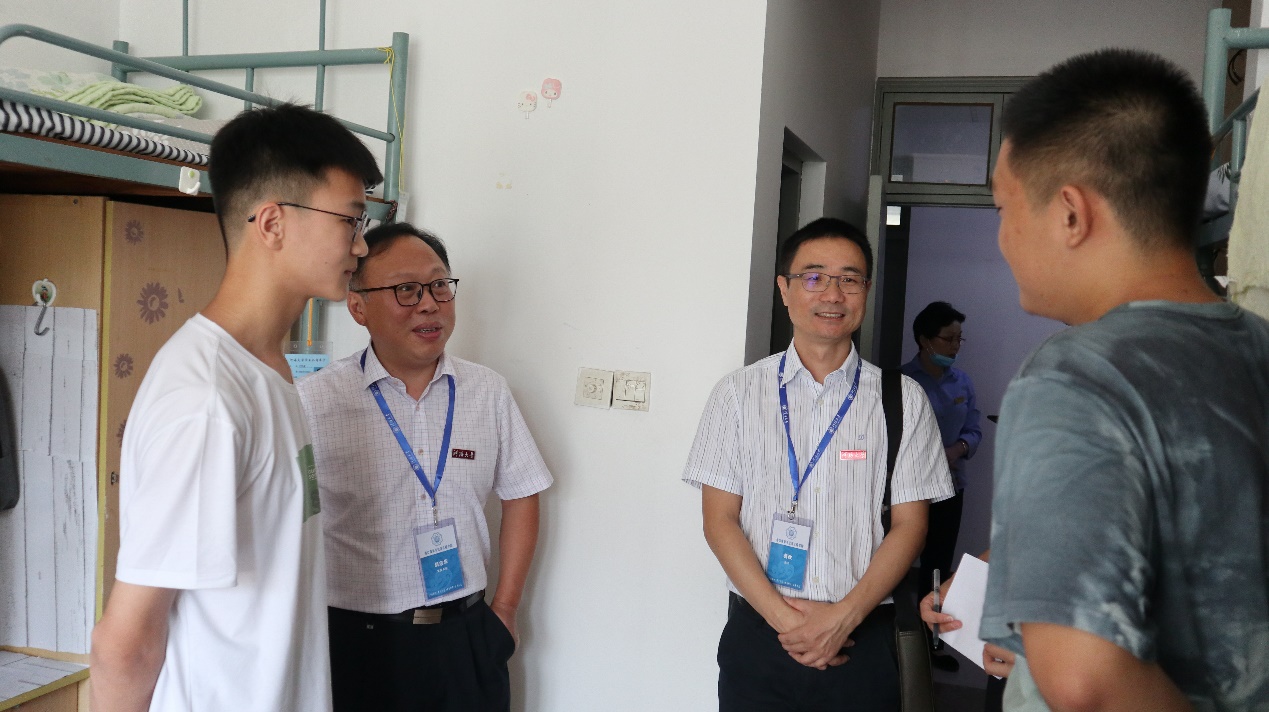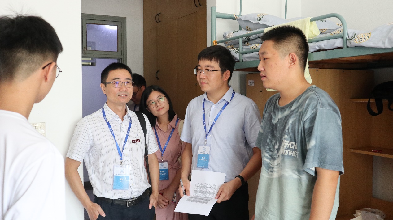 走访过程中,龚院长、胡书记、沈书记同新生们进行了亲切地交流,询问了新生生源地和报到情况,关心同学们对新的学习生活环境适应情况,提醒新生注意宿舍环境卫生和用电安全,并对学生的未来职业生涯规划提出建议。同学们也亲切地向老师们说明了在学习、生活、就业、社团活动以及学生工作等方面的期待。最后,学院领导们来到宿管站,对宿管阿姨的辛苦工作表示感谢。