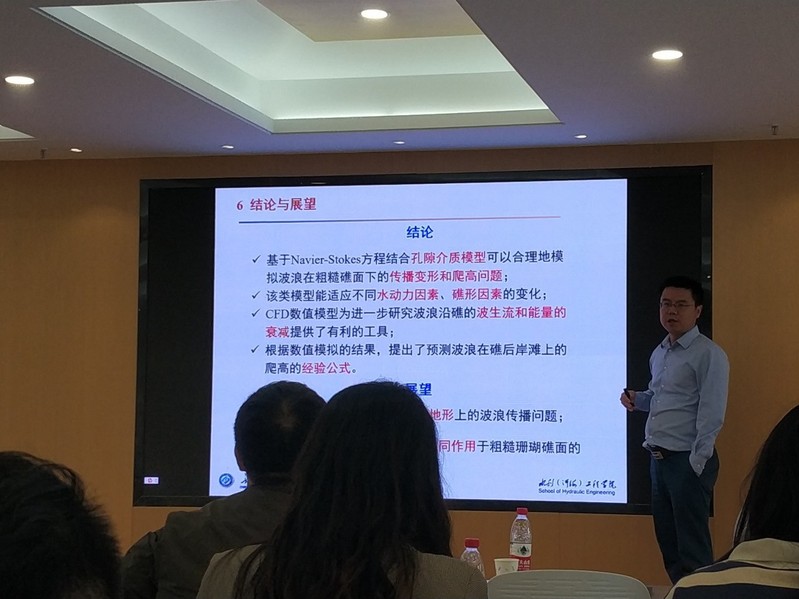 研讨会由专题讨论及水波动力学专场学术报告会组成,报告会共包含13场学术报告。专家老师们围绕水波动力学理论、波浪与结构物物理模型实验、CFD数值模拟和运用研究等方面开展了深入的探讨与交流,研讨会在浓烈的学术氛围中圆满结束。