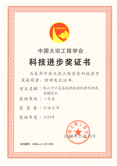 我院孔俊教授参与完成的“珠江河口复杂咸潮运动机理及抑咸关键技术”项目获2020年度中国大坝工程学会科技进步一等奖。该项目针对新时期珠江河口咸潮防控的需求和薄弱环节,深入研究了河口区径潮相互作用下的咸淡水混合机制及上溯过程,提出了水幕抑咸技术、最优化阻水调配模式和统计回归预报方法,创建了珠江河口“上补-中蓄-下阻”的综合防控体系。该成果广泛应用于珠江委、广东省水利厅及地市行政主管部门、供水企业等,为粤港澳大湾区水安全保障规划、珠江河口综合治理规划、珠江河口治导线规划、珠澳供水水库群联合调度规程编制等提供了有力的技术支撑,取得了显著的生态环境与社会经济效益。