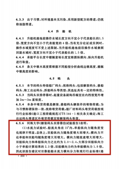 我院严士常老师具体完成的“舾装码头双排靠泊试验”得到双靠船舶分别在水流、风、波浪单独作用以及风浪流共同作用等不同工况下船舶运动和受力的规律,提出风荷载、船舶作用力和系缆力的计算方法,为本标准所采用。
