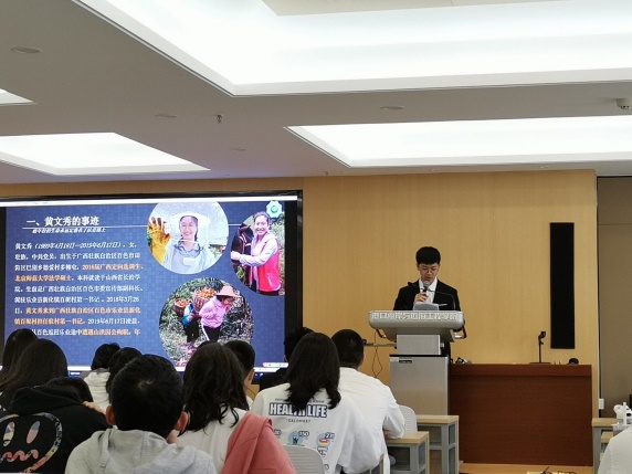 吴莹莹同学分享了家乡贵州省福泉市牛场镇脱贫攻坚先进人物王华银和扎根基层的黄会民的两则故事,展现贵州实现减贫人数最多,同步减贫经济发展连续十年增长的历程。