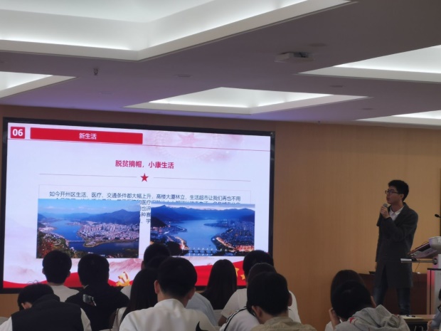 谷玉先同学先是简述了自己努力奋斗成为“自强之星”的故事,后分享了家乡盐城市滨海县前案村脱贫攻坚的小康之路和脱贫攻坚模范朱洪辉的事迹。