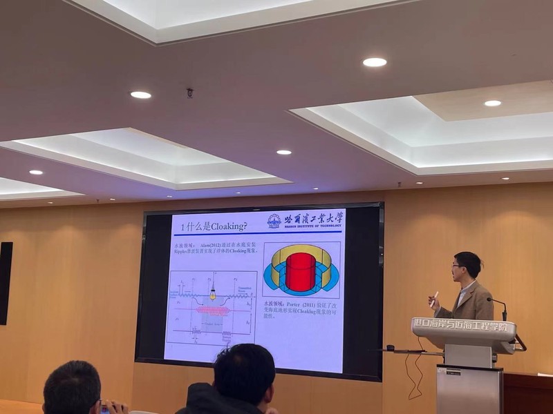 何广华教授作了题为“船海工程水动力数值模拟及应用”的学术报告,报告详细介绍了何广华教授课题组十几年来的代表性云开电竞app下载地址,包括船舶航行运动模拟,电平台设计,海上移动浮岛设计,强风浪中舰船的强非线性上浪、砰击预警系统开发和通气空泡的数值研究等。会后,何广华教授和与会师生就Cloaking现象影响因素的数值分析及其应用前景展开了讨论与交流。