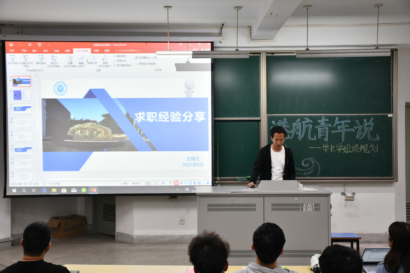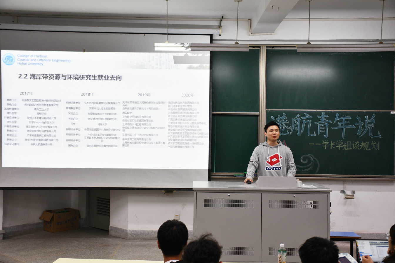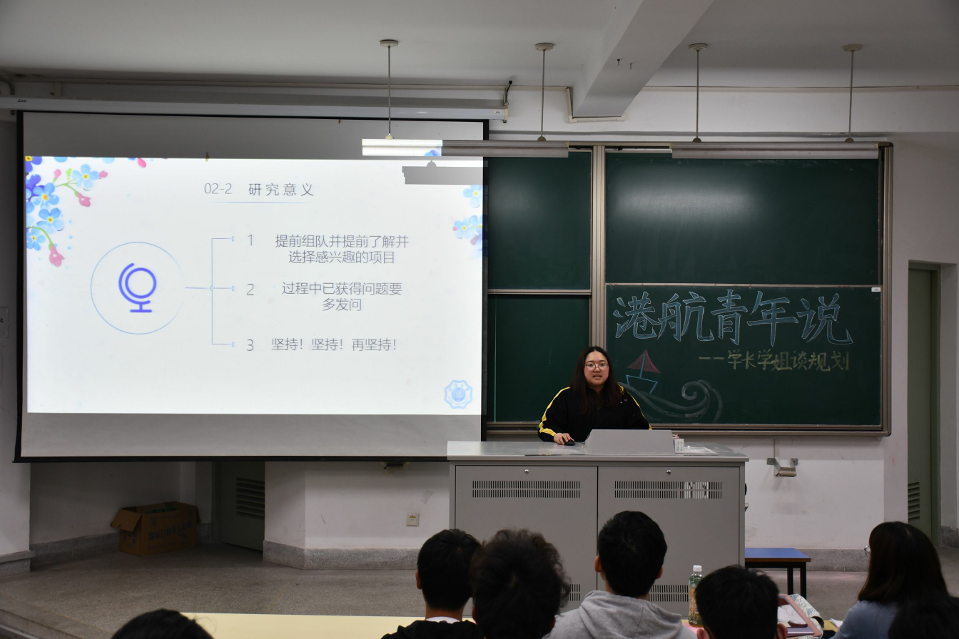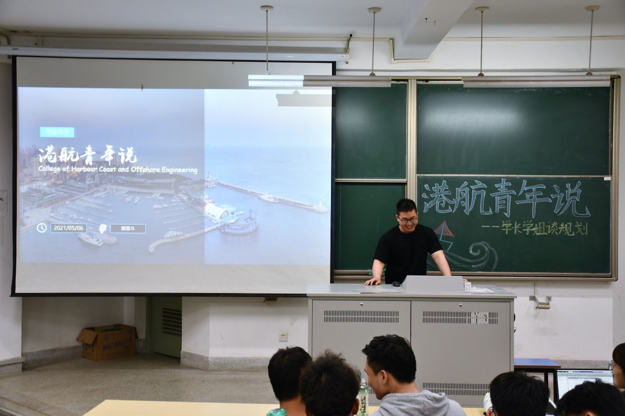 2021年5月6日,港航学院“港航青年说”—学长学姐谈规划于江宁校区勤学楼5112举行。本次活动邀请了港航学院研究生沈倩颖、丁星宇、王博文和本科生张颖男、张恩斗作为主讲嘉宾,向2019级学生分享大学生职业生涯规划经验。