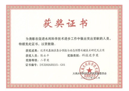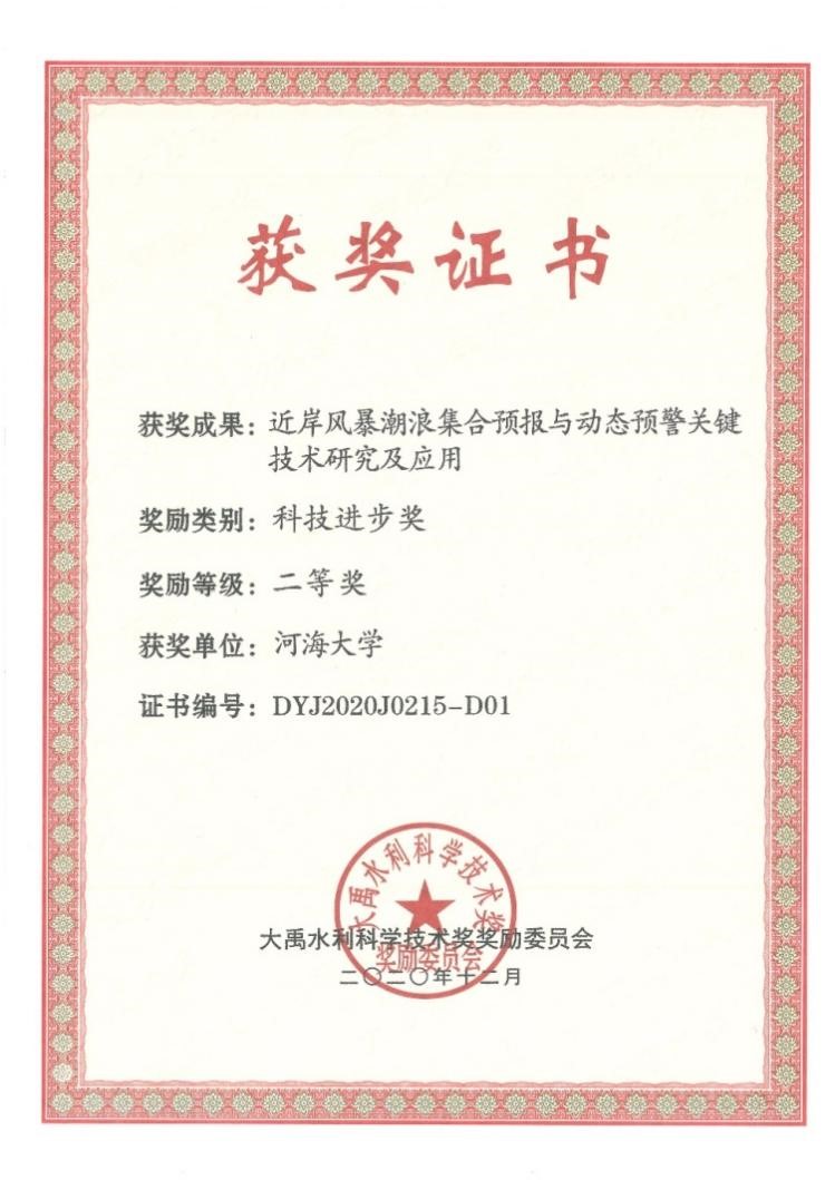 近日,大禹水利科学技术奖委员会颁发了2020年度大禹水利科学技术奖。由开云电竞网和水利部信息中心、南京水利科学研究院等七家单位合作完成的项目“近岸风暴潮浪集合预报与动态预警关键技术研究及应用”获得2020年度大禹水利科学技术奖二等奖。开云电竞网为第一完成单位,我院陈永平教授为第一完成人,潘毅青年教授为第四完成人,谭亚副教授为第七完成人。