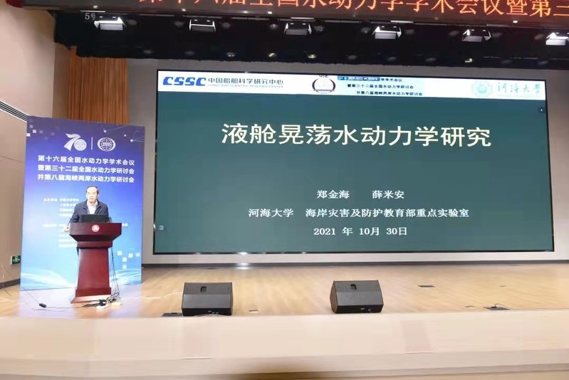 我院郑金海教授、薛米安教授、迟善航博士生、张怿帷硕士生等赴现场参加了本次会议。大会开幕式上,郑金海教授受邀作了题为“液舱晃荡水动力学研究”的大会报告。薛米安教授参加了《水动力学研究与进展》九届二次编委会会议并主持了“水力与河流”分会场会议,迟善航博士生作了题为“基于岸基视频影像的海堤风暴越浪现场观测研究”的分会报告,张怿帷硕士生作了题为“非对称指数型海脊上俘获波解析研究”的分会场报告。与会师生均与同行专家学者们进行了深入的交流与讨论。本次会议共评选出9名学生优秀论文奖,迟善航博士生荣获本次会议的“优秀论文奖”。