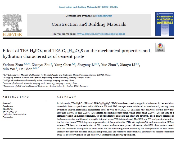 近日,由我院陈达教授领衔的近海工程结构腐蚀防护与修复研究团队与丹麦奥胡斯大学研究团队合作在混凝土工程领域权威期刊《Construction and Building Materials》(Q1,IF = 6.141)上发表题为“Effect of TEA·H3PO4 and TEA·C18H30O3S on the mechanical properties and hydration characteristics of cement paste”的学术论文。