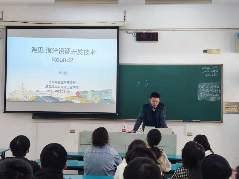 随后系主任姚鹏以“遇见·海洋资源开发技术专业”为主题向同学们详细介绍了海洋资源开发技术专业,为同学们提供专业的讲解。并针对同学们关心的专业前景和就业问题给出了详细回答,“十八大报告中提出要建设海洋强国,十四五规划中也提及要加强海洋生态保护,提升海洋生态环境治理能力,目前海洋专业人才紧缺,国家大力培养海洋专业人才,本专业符合时代需求,符合国家海洋强国战略。”姚老师也向同学们介绍了该专业的一些研究方向,希望同学们可以从中找到自己感兴趣的方向,积极响应国家海洋强国战略,在国家海洋建设方面发光发热。