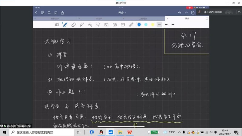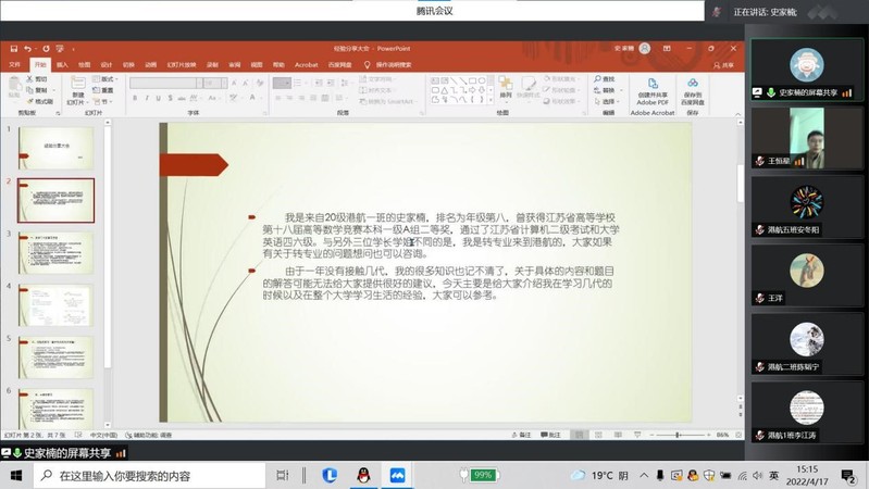 2022年4月17日,港航院同舟课堂系列讲座第四期——高数、线代、工图、大物经验分享会在线上成功举办。本次活动由港航院20级的方琳涛、史家楠、姚秋雨、蒋佩漪主讲,他们就自己对于各科特点的理解,分别从高数、线代、工图、大物向21级的学弟学妹们进行了经验分享。港航院21级辅导员王恒星老师以及港航院21级同学参与了此次分享会。