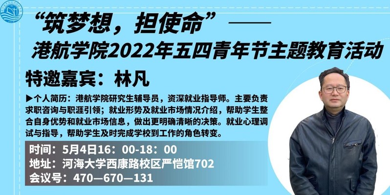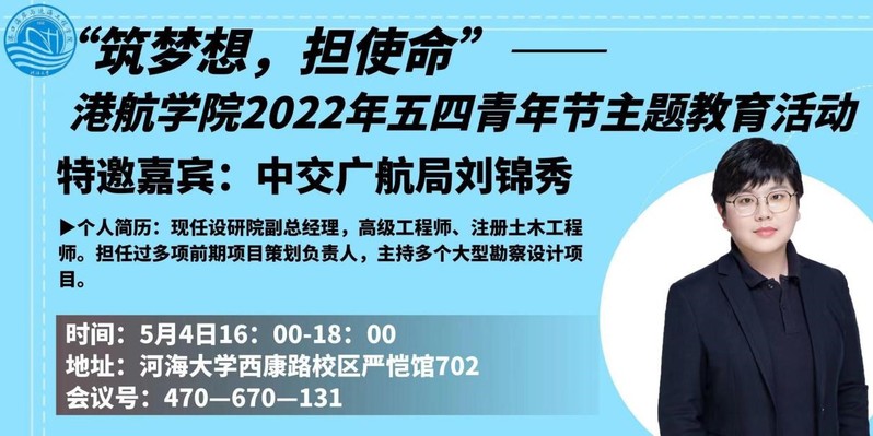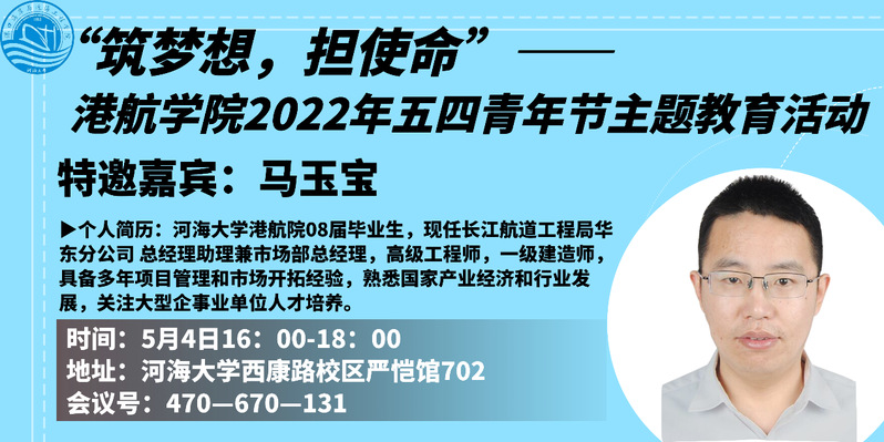 2022年5月4日下午,港航学院2019级组织开展了“筑梦想,担使命”五四青年节主题教育活动。本次活动特别邀请长江航道工程局华东分公司总经理助理马玉宝、中交广航局设研院副总经理刘锦秀、学院研究生辅导员林凡老师为2019级学生开展五四主题教育,结合校友基层建设经历,引导学生专业报国,投身国家战略建设。