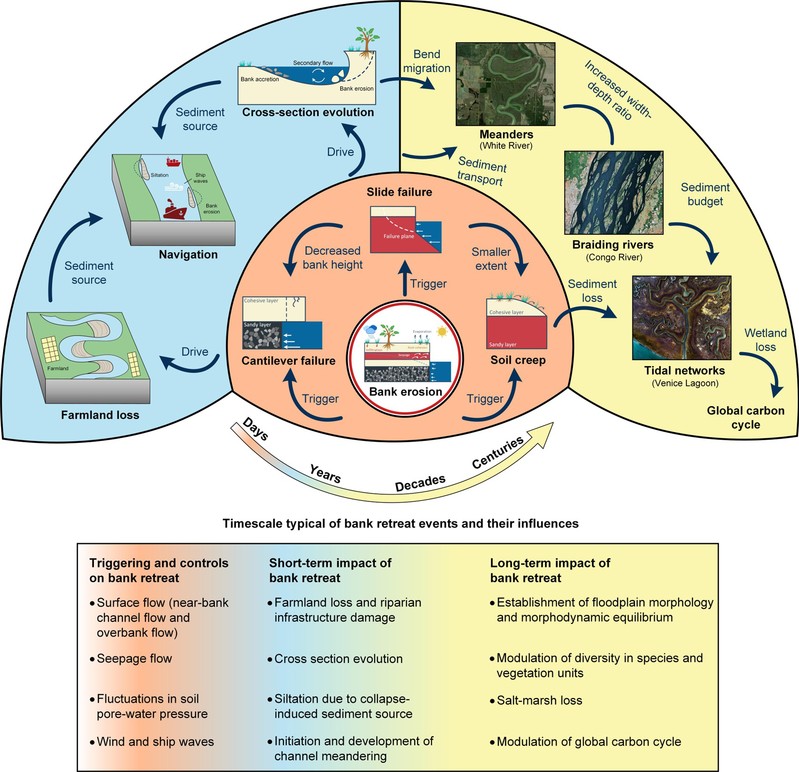 近日,我院赵堃博士后撰写的题为“A Review on Bank Retreat: Mechanisms, Observations, and Modelling”的论文被国际顶级期刊Reviews of Geophysics录用。该论文系统介绍了边壁侵蚀后退过程的形成机理及其地貌效应。