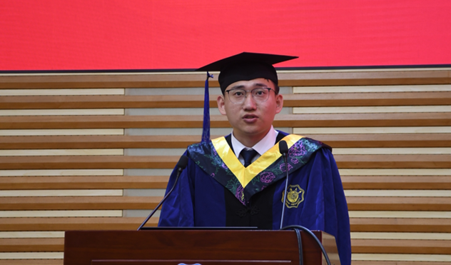 毕业生代表张稼昊同学通过回顾在河海的七年成长与收获,表达了全体毕业生对母校的依依惜别之情和对老师的崇高敬意,并表示决不辜负学校和学院的培养,以优异的成绩彰显河海学子的风采,在祖国需要的地方绽放青春之花。