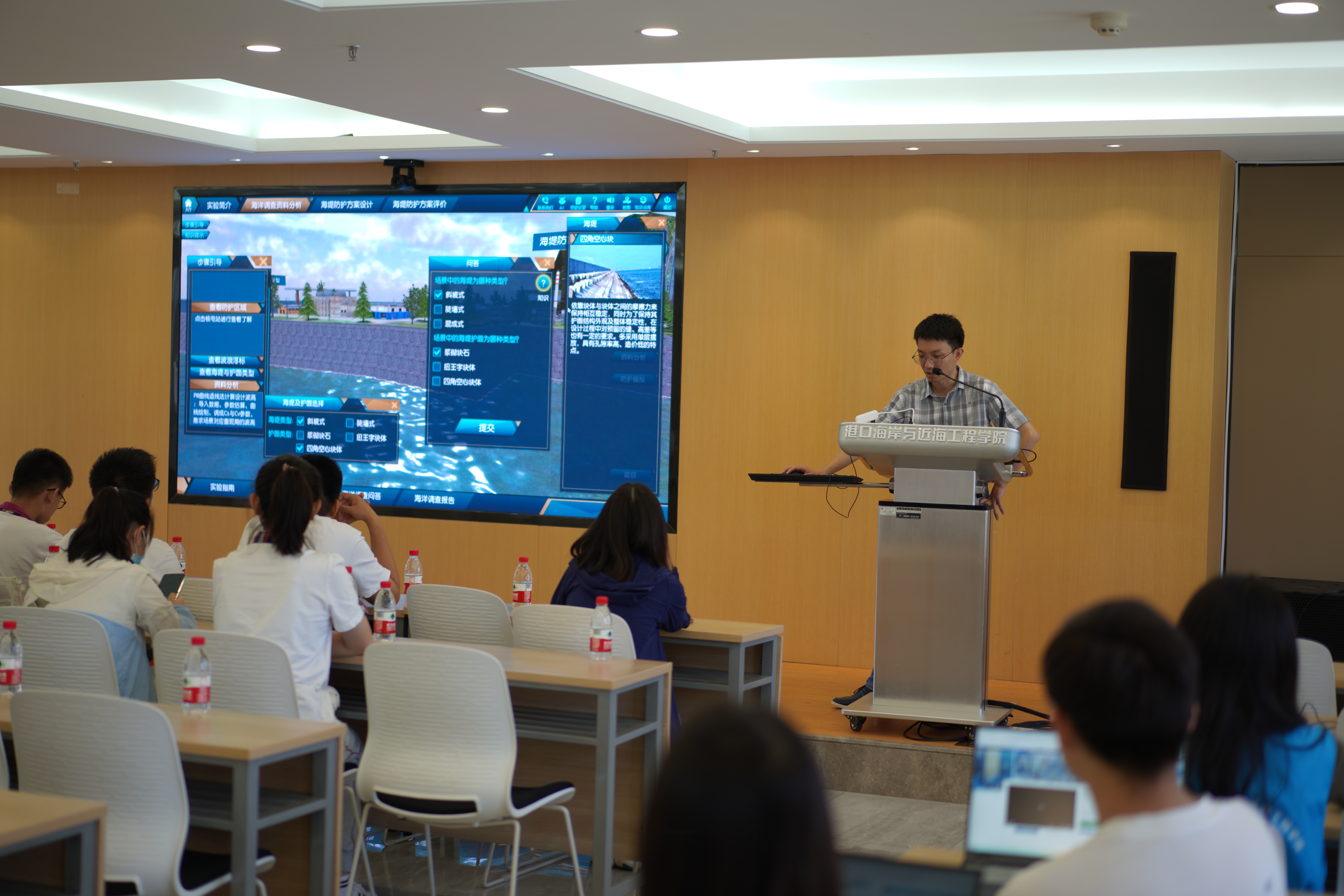 在严恺馆702会议室,南京一中2013届毕业生、港航院辅导员林晨老师介绍了我校的办学情况,带领同学们了解了水利学科的内涵与特色。姚鹏老师为同学们带来了海岸防护科普讲座,鼓励同学们上机体验海平面上升环境下海堤防护虚拟仿真实验系统,生动学习了海岸防护的科学知识。借助乐高模型,陈欣迪老师为同学们讲解了海洋、波浪的相关知识。同学们在科普讲座与互动游戏中领略了我国水利事业的建设成就,培养了科学文化素养与创造性思维。