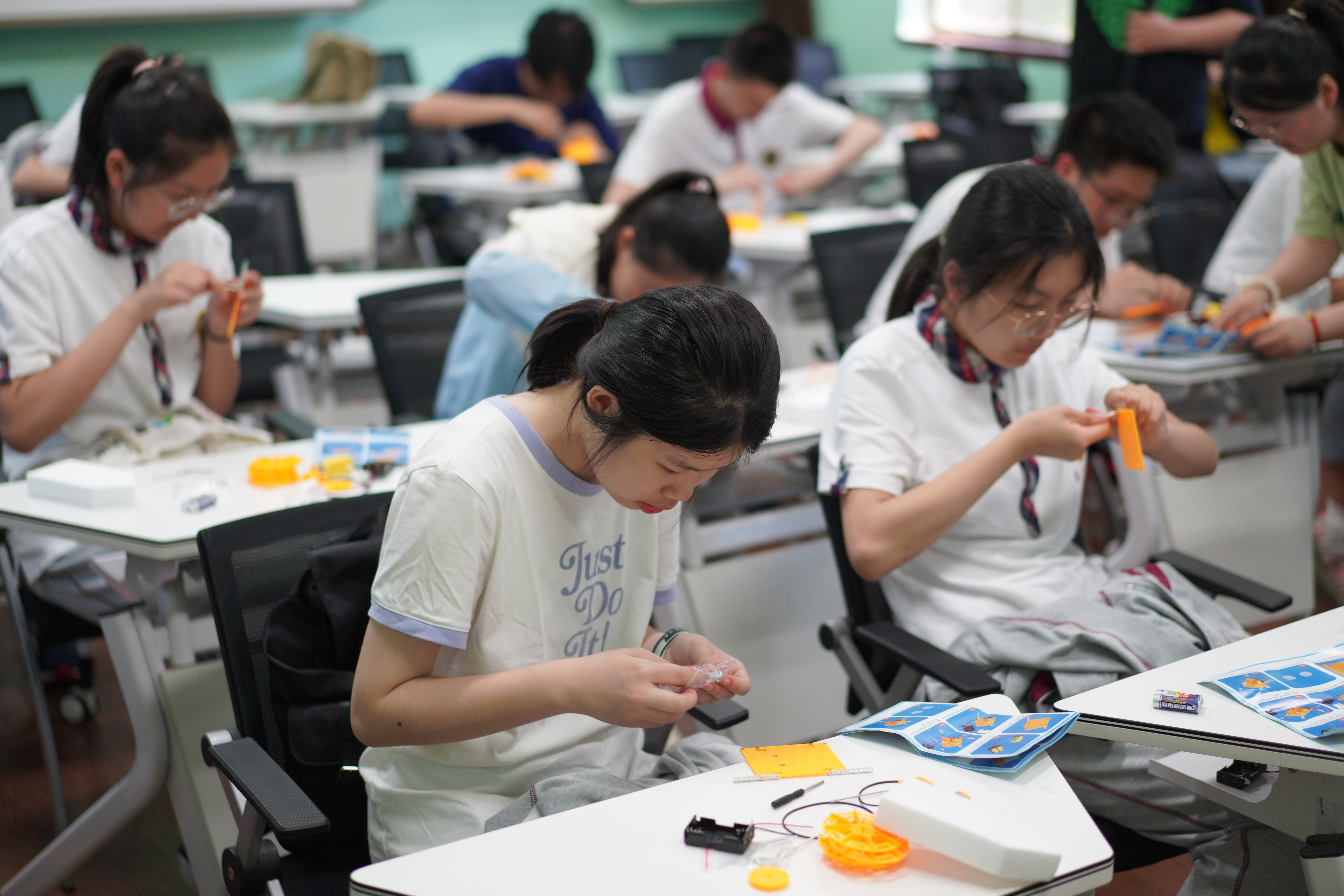 在教室里,南京一中高中生与我院学生交流大学生活,一起完成了海上装备模型拼装活动,帮助同学们在活动中感受实践探索的魅力,丰富了学生的水利常识,提升了其实践动手能力。