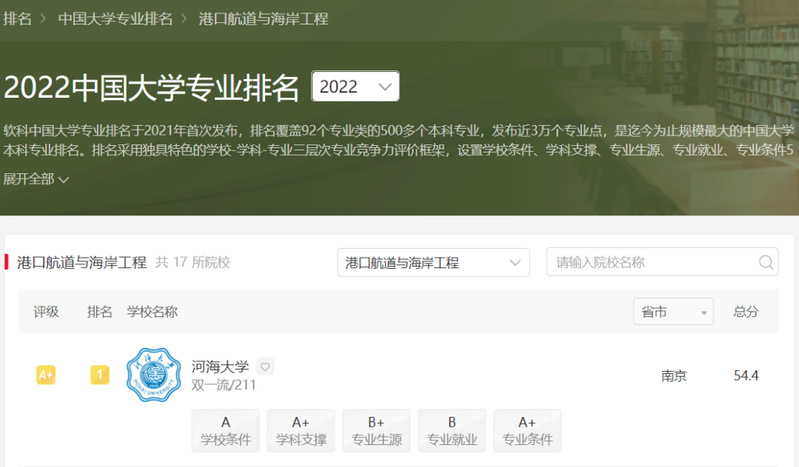 2022软科中国港口航道与海岸工程专业排名:开云电竞网第一