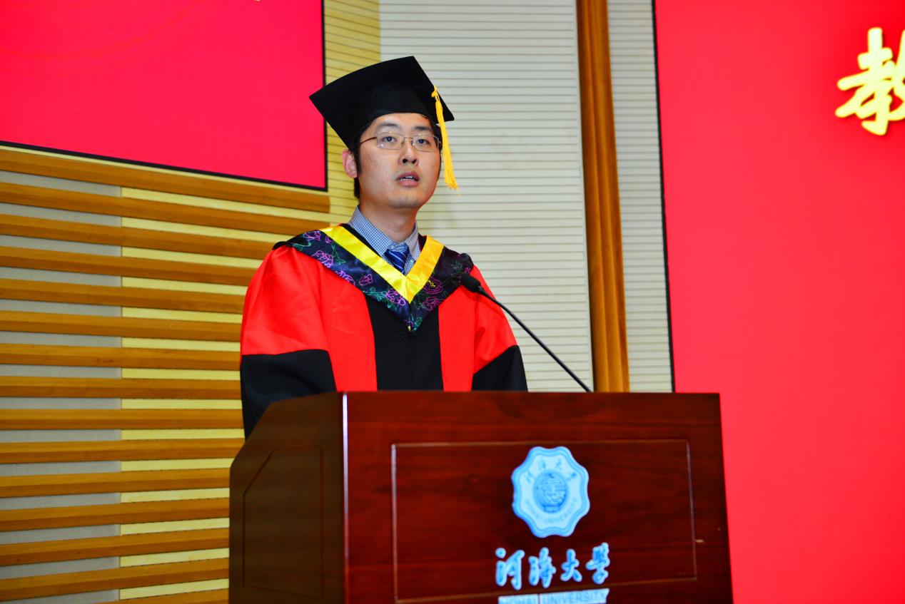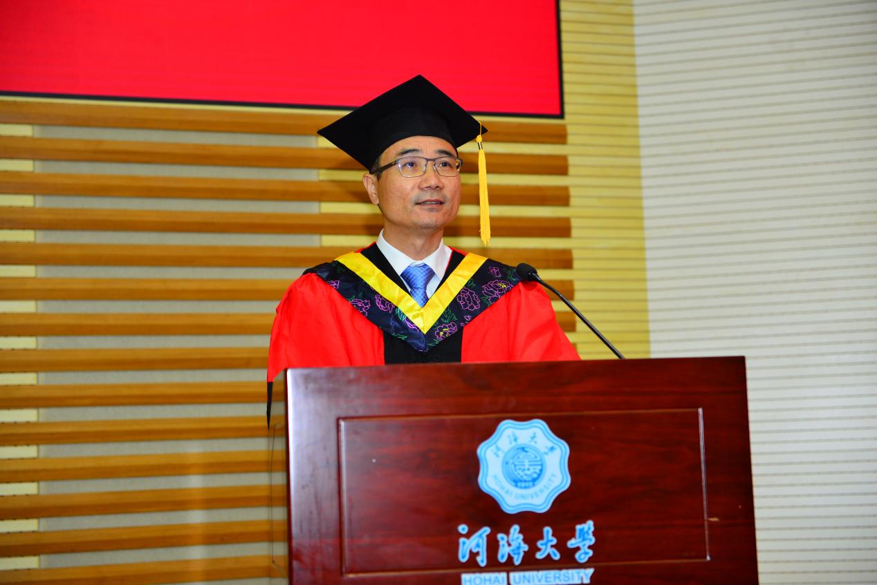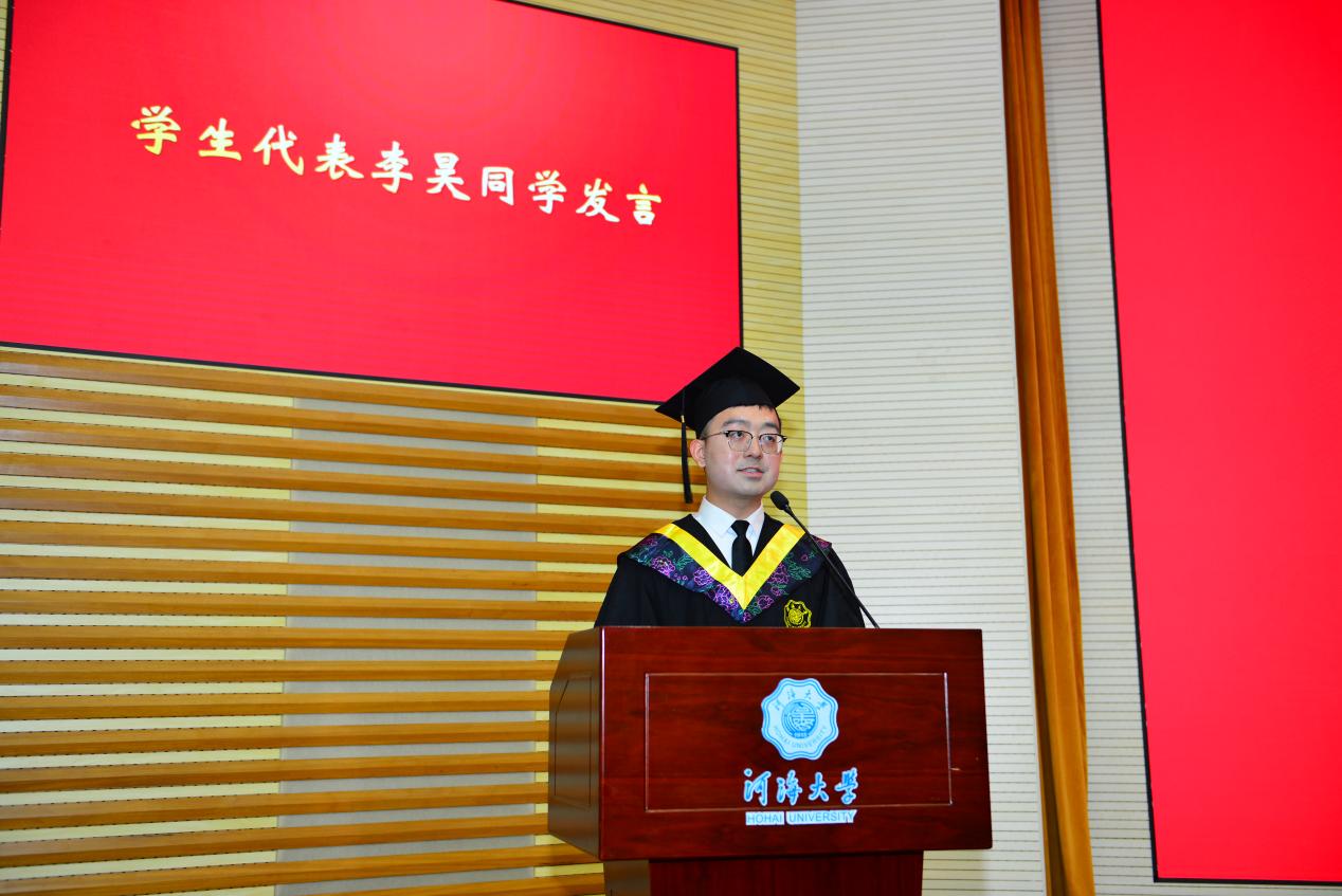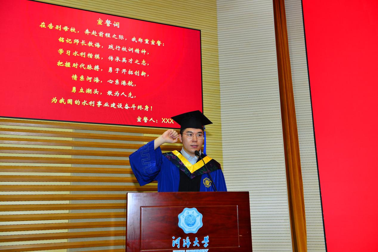 领誓代表2020级硕士毕业生张万威同学带领全体毕业生进行宣誓,“情系河海,心系港航;勇立潮头,敢为人先;为我国水利事业建设奋斗终身”。